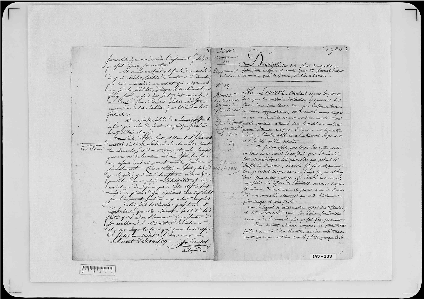 JD Breton 1843 patent, number 24935, This patent is from JD Breton, one of Laurent’s apprentices. He produced at least one glass flute.