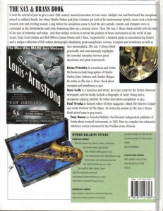 A few years ago my repair tech in Halifax, Layne Francis, showed me a really beautiful hard cover, colour photo book titled: The Sax & Brass Book: saxophones, trumpets and trombones in jazz, rock and pop. The publisher was Balafon Books in the UK. Copyright © 1998. I managed to find a copy of the book at the Fredericton, NB Chapters store in the clearance bin, because the chain had bought up boxes of them as the book went out of print.