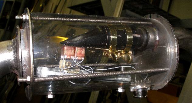 This instrument is a computer controlled acoustical saxophone. The instrument can be played by standard MIDI commands, but it is also capable of producing a wealth of multiphonics, slaptongues and other special effects. The sound production is realized through an acoustical but computer controlled reed mechanism using a compressor for the wind supply and a fast regulating conical valve for expression control.