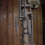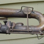 Here we have a very old and rare Eb Rothophone or Saxsarrusophone for those purists out there.This 38″tall double reed relic was found in a local attic recently in an old Italian-American neighborhood. The major deficits are as follows..It is missing the Bocal and there is a crease on the stack which is missing one tone ring as well.Other than that all the keys are present and free,there are no major dents or bent keyrods,and is covered in a “protective”patina,with the exception of the bell face which has been polished to reveal it’s hidden provenance which is:Brevetto Bottali,Primaria Premiata Fabbrica,Flli.A.M.Bottali Milano Italia. Massime Onorific,Esposiz Mondial,Marca Ferd.Roth 83. A google search revealed a couple of Baritones in private hands but any competent woodwind Tech should be able to repair and restore it. Please email me with any questions or requests for more detailed pics.