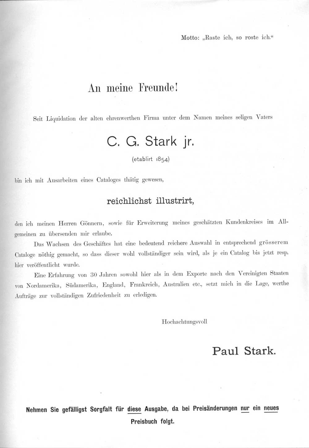 - This catalogue is not from the 1900s. It is however, from the 19th century. These catalogue pages, from the Paul Stark company of Markneukirchen, Germany, are from 1893.