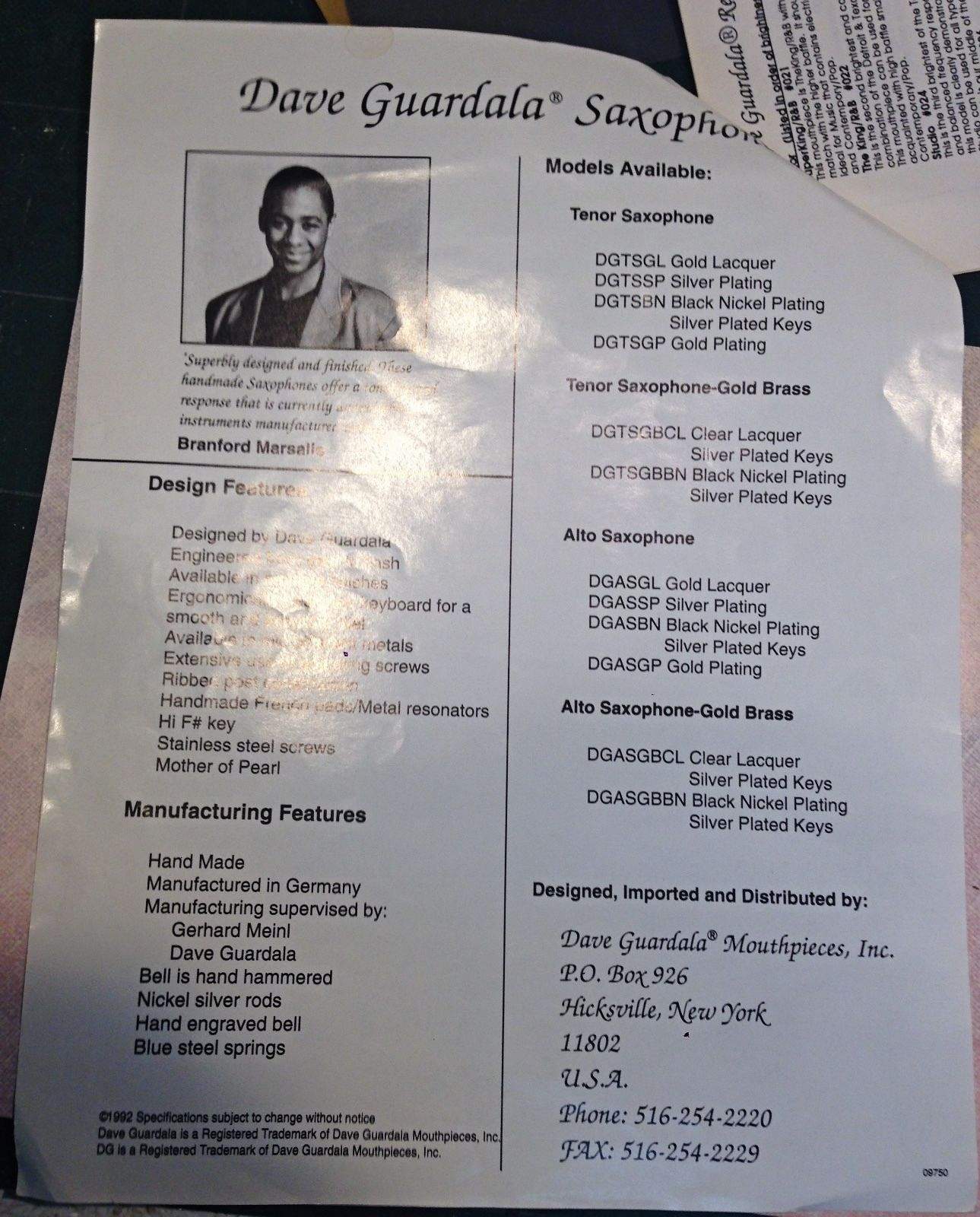 Ever since I wrote the Dave Guardala page, it has become one of the most popular pages on my website. Therefore, it only made sense that when I saw these Dave Guardala saxophone brochures on eBay, I would bid on them in hopes I could fill in any information blanks that I have on the brand. In the past I have had no problem winning auctions like this, since no one bid on the obscure stuff I bid on.