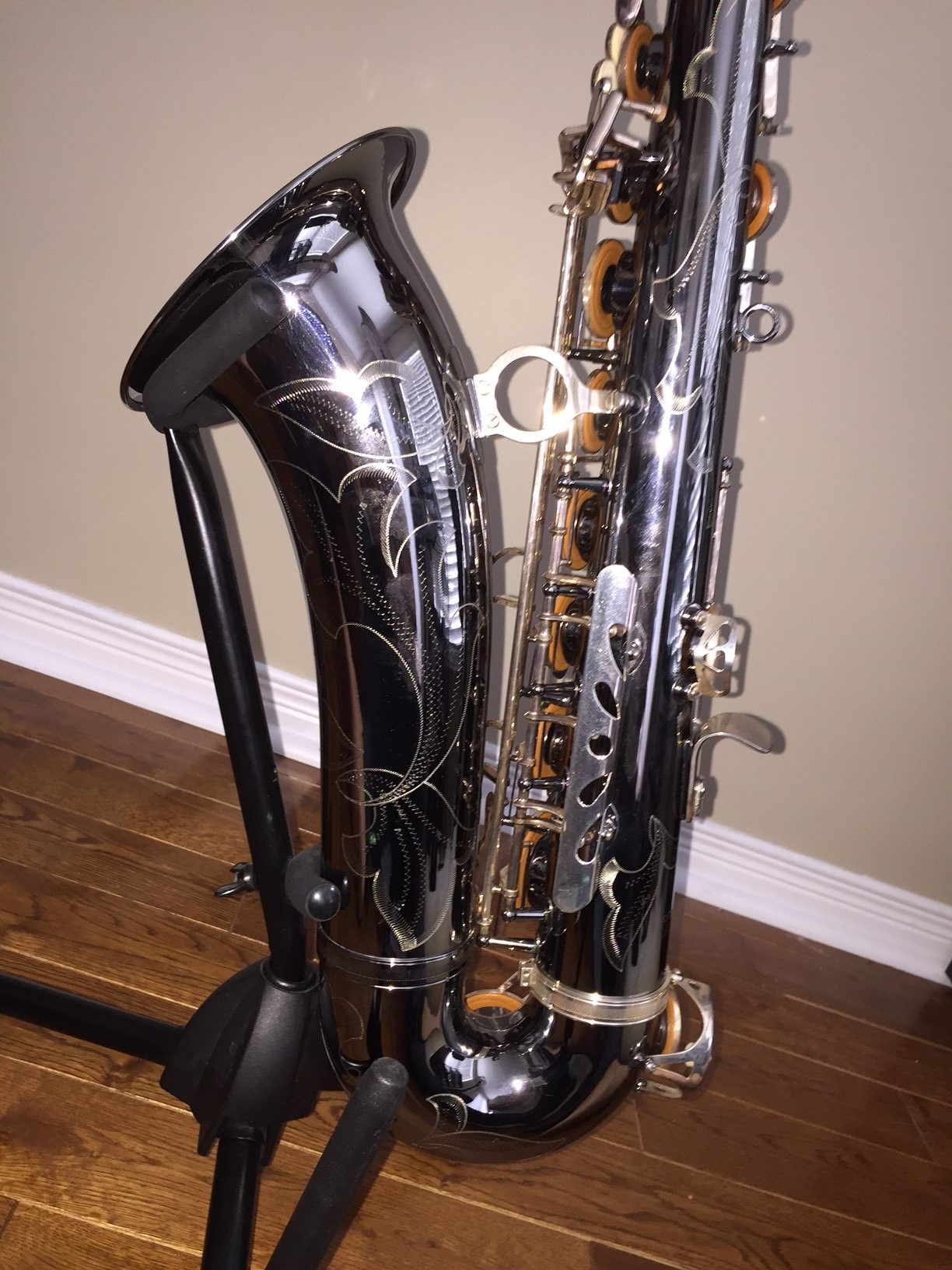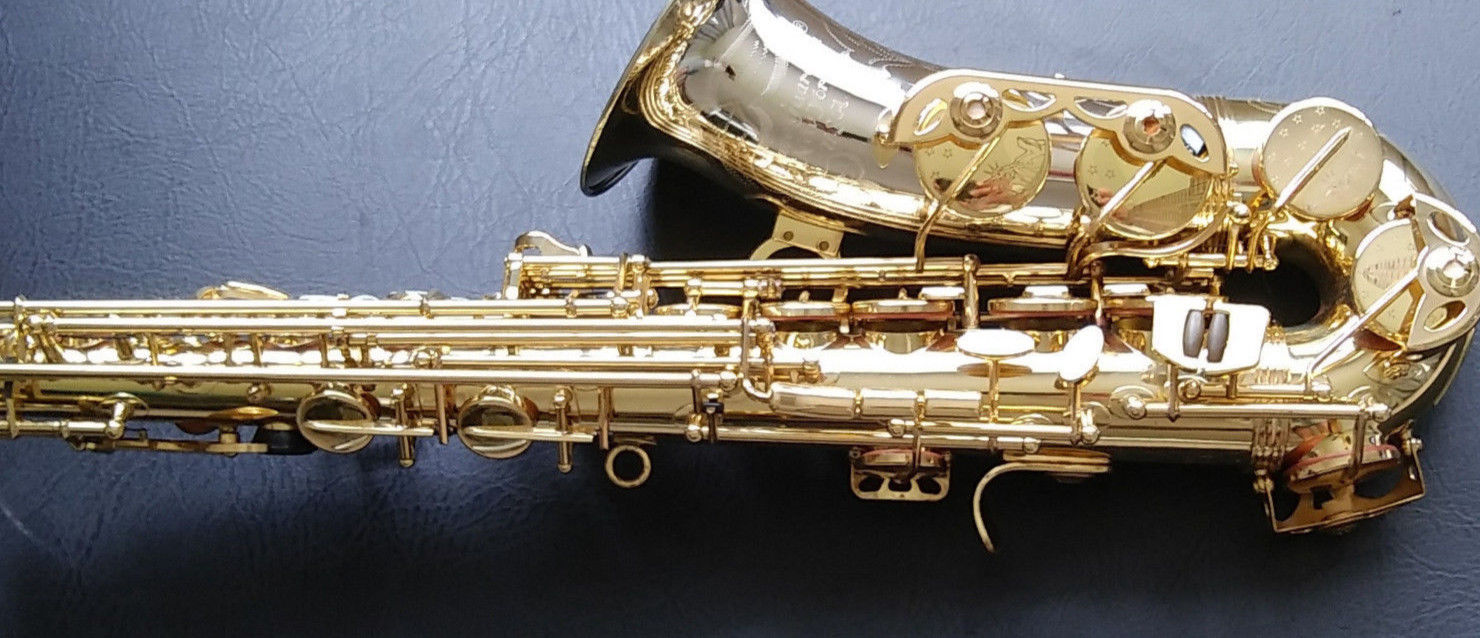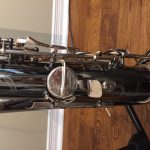 One thing that both the alto and tenor shown above have in common is their finish. Both are ostensibly a black nickel plate, with silver plated (?) keys. Just a tiny bit of digging turned up a lacquer alto of unknown serial #. It was advertised on eBay in September 2018, and was said to have a nickel silver neck and bell.