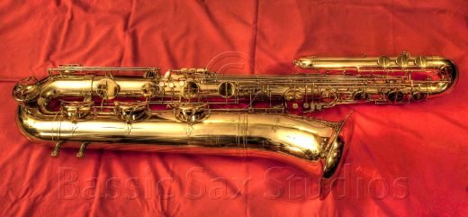 - Appears to be a copy of the current production Selmer Series II bass saxophone