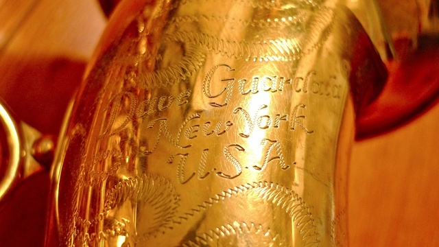 - 1990s, B & S, Dave Guardala New York, Drawn Tone Holes, Germanic, right side bell keys, Sheet Metal Keyguards, Straight Tone Holes, Vintage Brass Finish