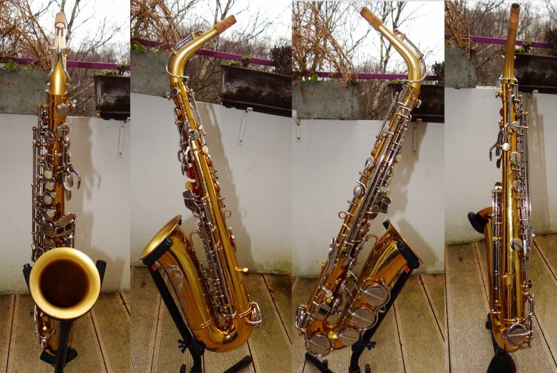 This horn has straight tone tone holes; the new-style left pinkie cluster; as well as the new-style bell to body brace. However, it is not keyed to F#, and it still has the C/D trill key.