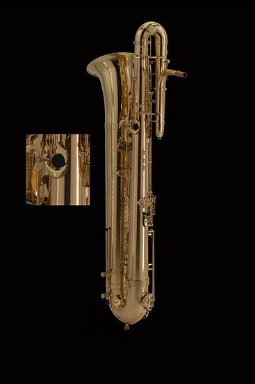 Special adaptation made by J’Elle Stainer of a unique low A mechanism and extended body and bell in a classical bass saxophone.