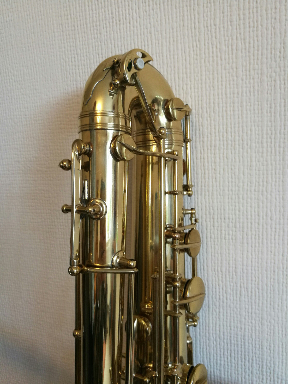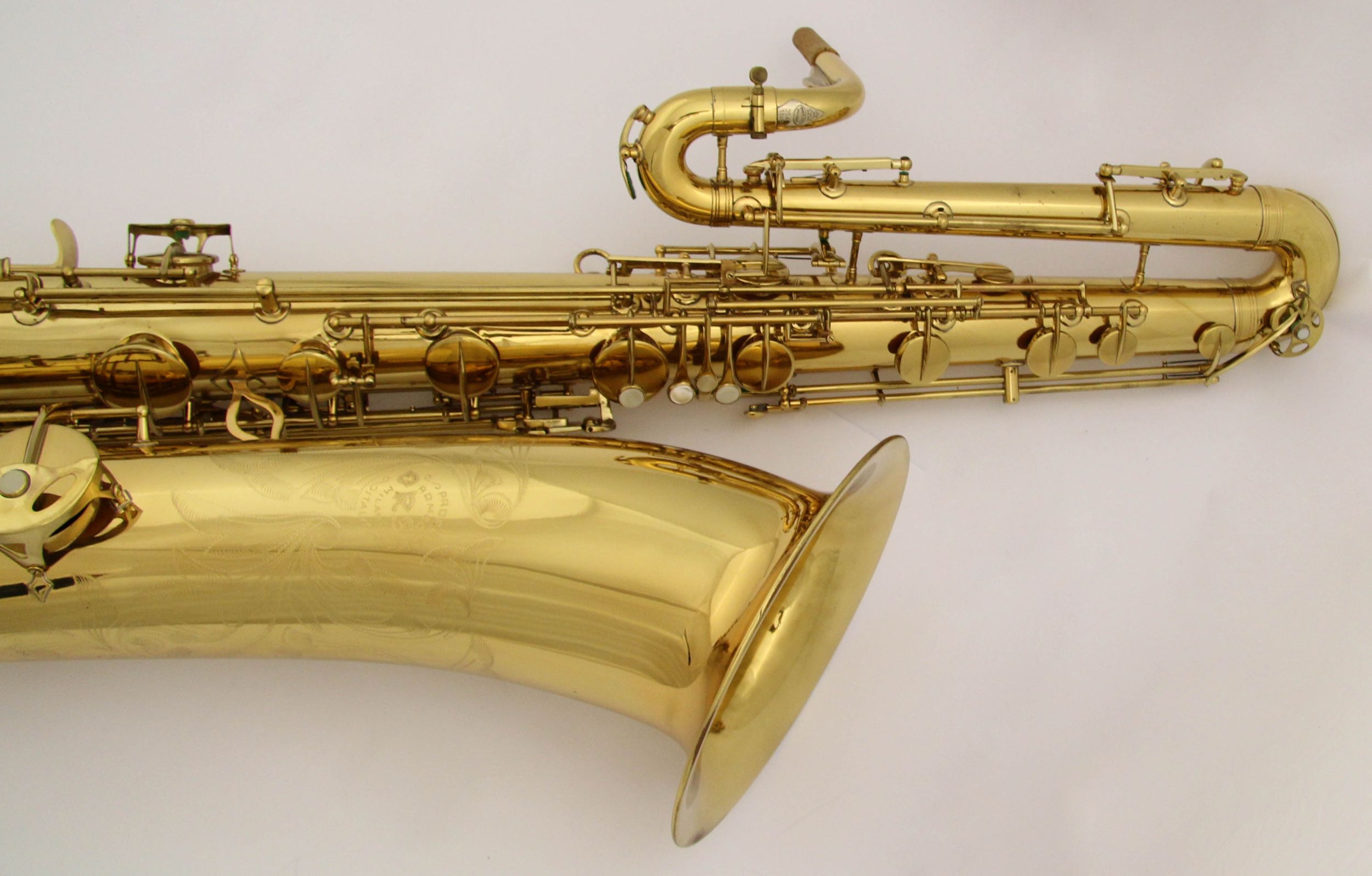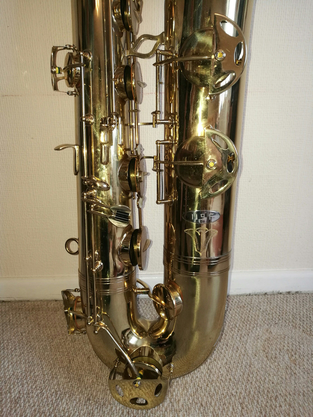 The 119F, was built as a pro model horn. It, along with the other 119F (#3547) shown above ^^^^, has among the most bells and whistles of any of Orsi’s bass saxes I have seen to date.