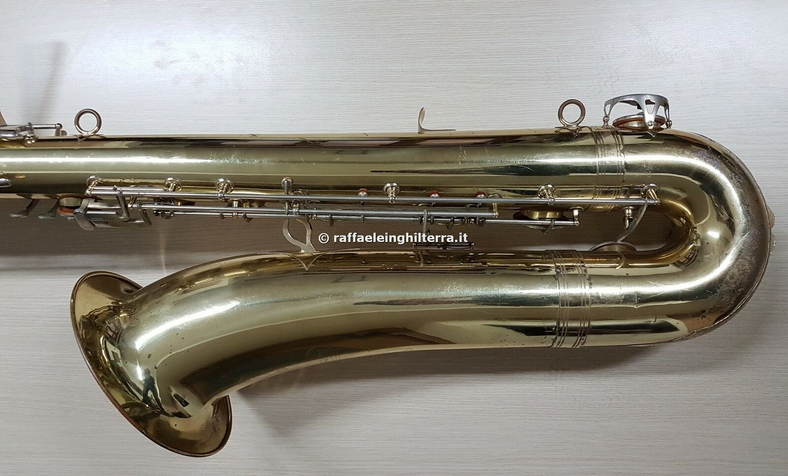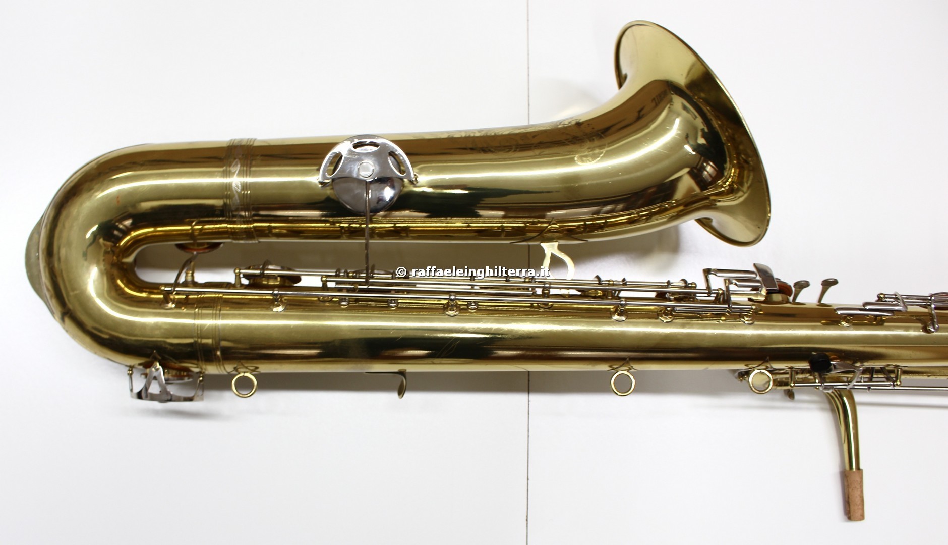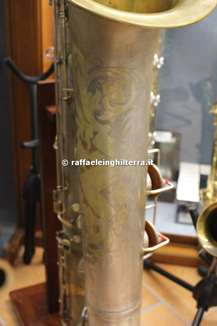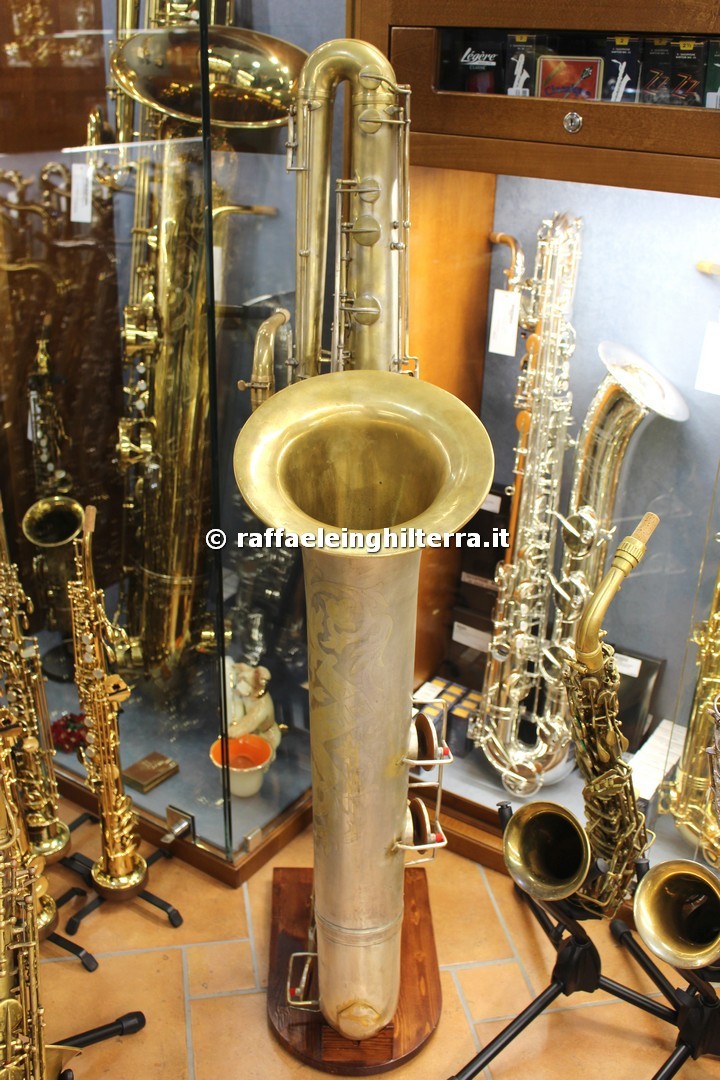 Now where would Raffaele Inghilterra get a NEW Orsi contra from? I am guessing this is actually a display model, since to the best of my knowledge Orsi has stopped making saxophones altogether—not to mention that photo has been around almost since the dawn of the Millennium. The contra that’s for sale also appears to be in a display cabinet specifically built for it. This display cabinet is prominent on the store’s website and YouTube channel.