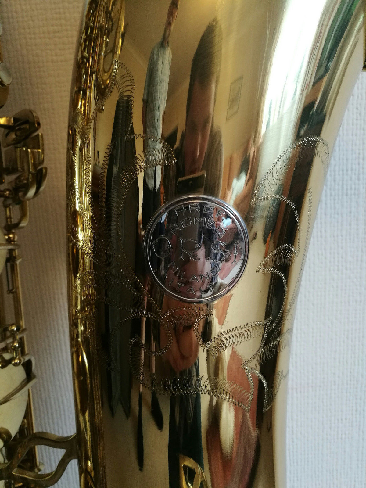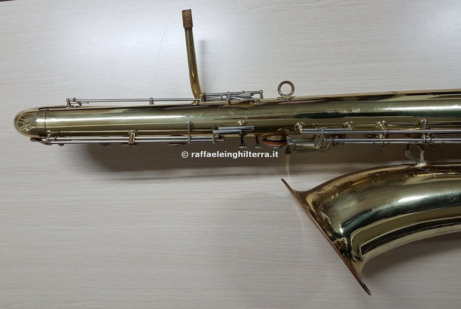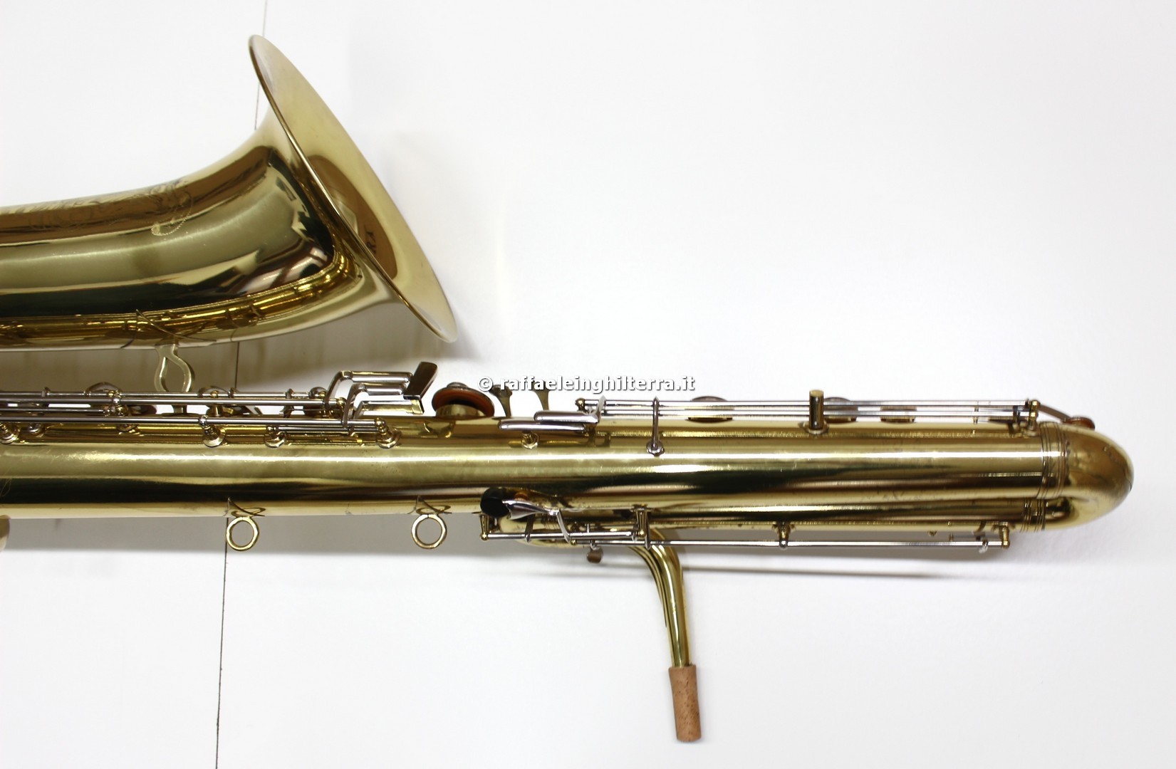 Now where would Raffaele Inghilterra get a NEW Orsi contra from? I am guessing this is actually a display model, since to the best of my knowledge Orsi has stopped making saxophones altogether—not to mention that photo has been around almost since the dawn of the Millennium. The contra that’s for sale also appears to be in a display cabinet specifically built for it. This display cabinet is prominent on the store’s website and YouTube channel.