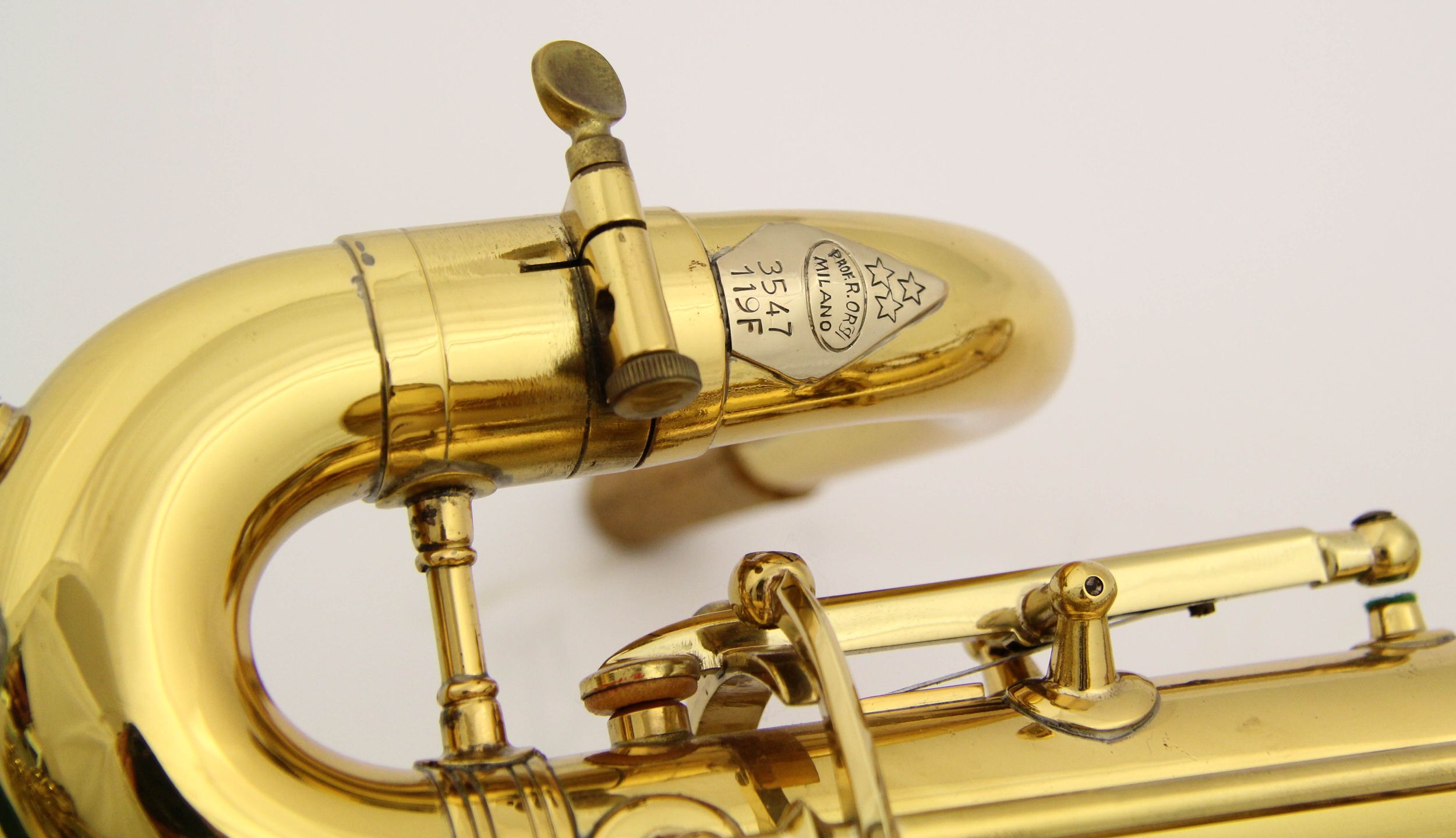 | Orsi #3547 | 119F | Pro | Long wrap (vintage American style) | Lacquer | More modern | Post to body | Bb-F (F#) | 3 | 2 | Yes | Right-sided | Compact, more modern with 4 rollers | 2 | 3 | Yes | Sheet metal with mini-decorative "pearls" on the bell keys, and felt showing through the adjustment hole on the bow |