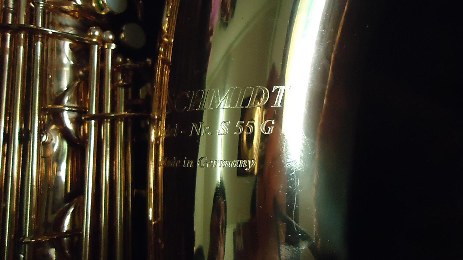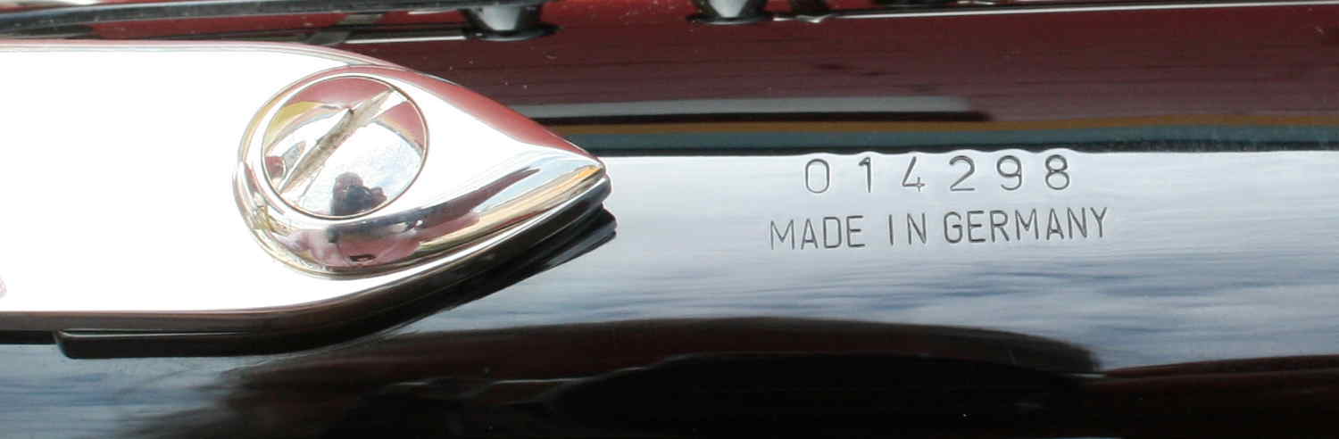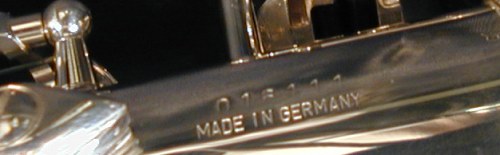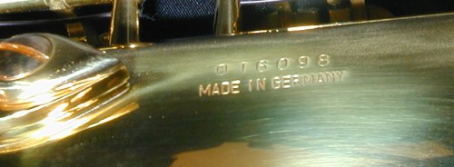 The location of the serial number is also important. B&S always stamped their horns in the same place. They did not stamp their horns above the bow to body tube connecting ring. Rather, the serial number and Made In Germany stamp is always located below the right thumb rest.
