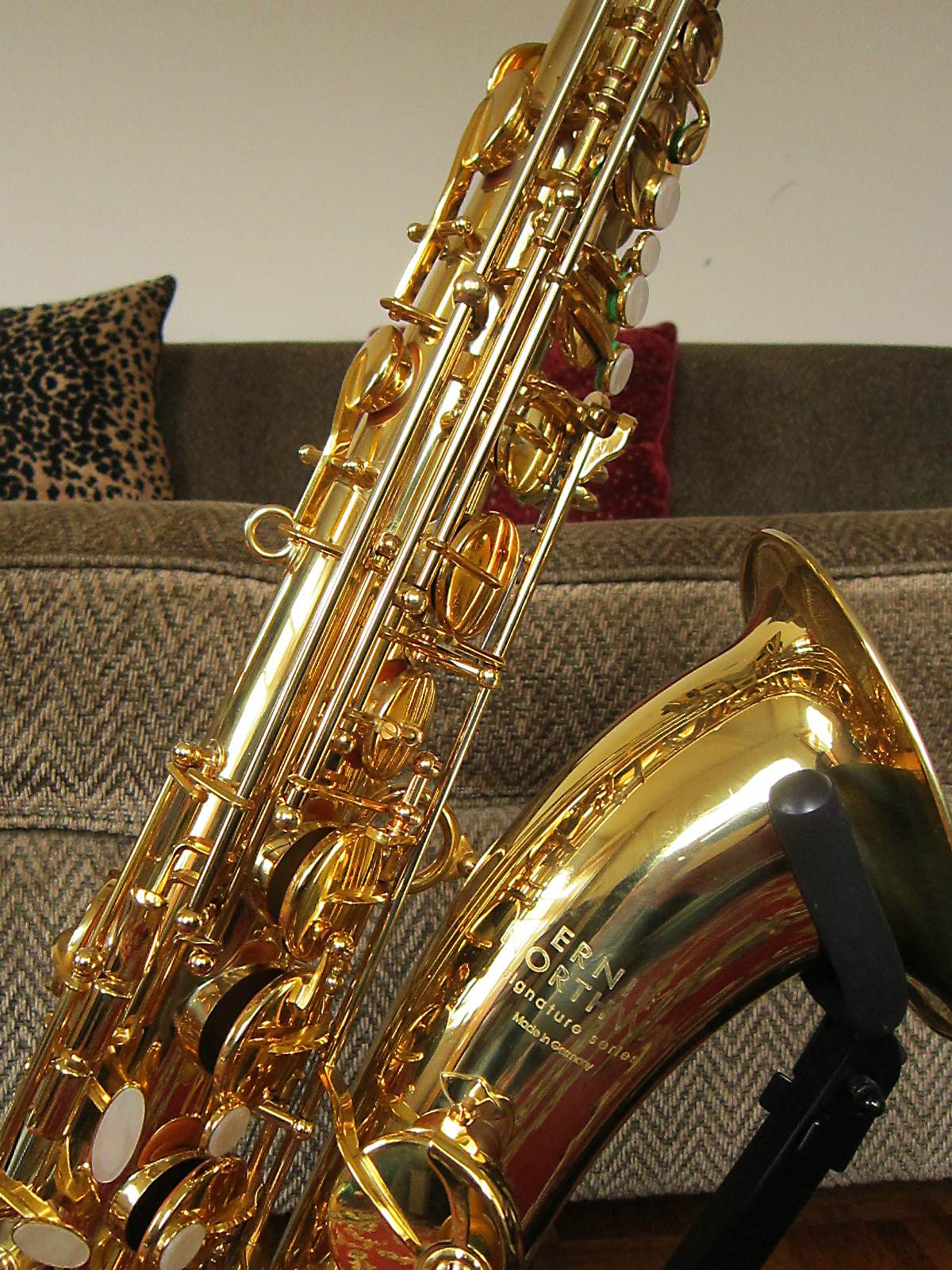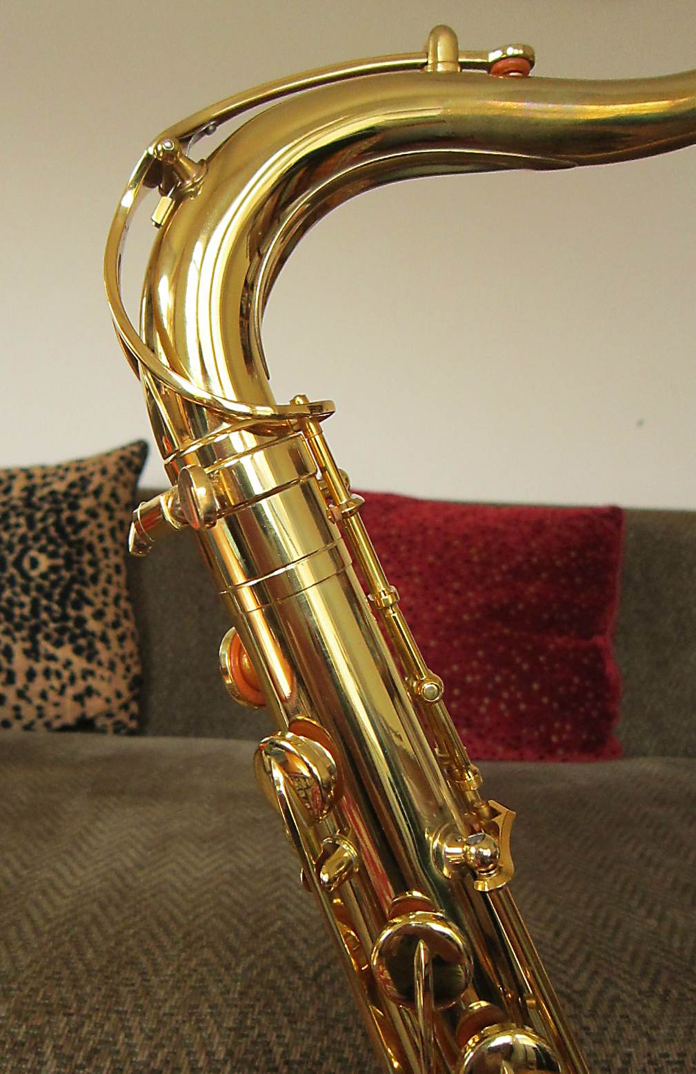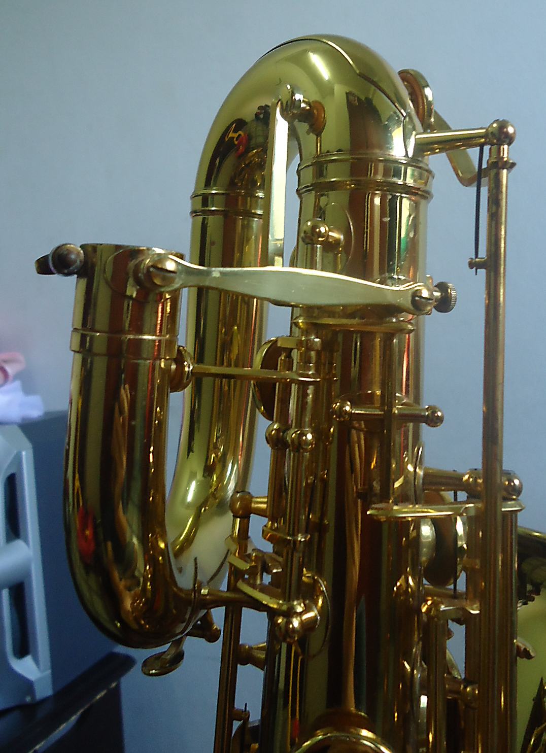 The easiest way to differentiate between a pro model B&S saxophone and an intermediate model is by the bell to body support ring.