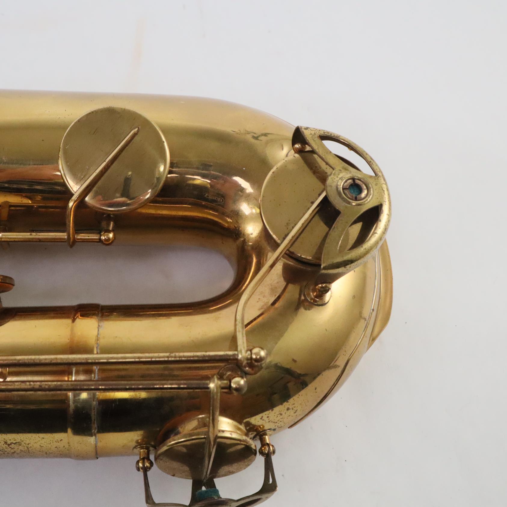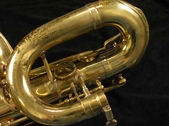- #733xx also shows no evidence of ever having had a pigtail brace—let alone two. The owner of the horn is a SOTW member and provided me with clear, detailed photos of all areas of the horn. He did mention that when he bought the horn back about 10 years ago, his tech did do some work on the pigtail since it was out of alignment. Looking at the photos you can see the solder marks where the parts were rejoined. This leaves us with two possibilities: 1. The horn never had any bracing there to begin with, or 2. Part of the pigtail was replaced. Either way, Superba II low Bb bari #733xx is again what one would call an enigma.