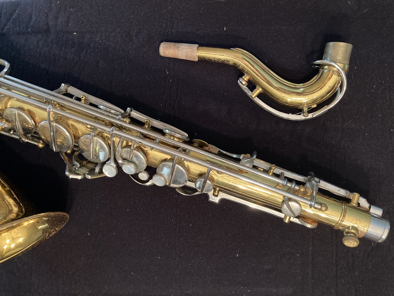 Look no further than this alto with it clarinet-shaped right palm keys. It’s like whoever designed this was either a clarinet player, or was experimenting with key shapes. My best guess is that this was a custom order from the factory somewhere between 1955-59—according to the serial number—by clarinet player who doubled on sax. Otherwise these keys almost make no sense.