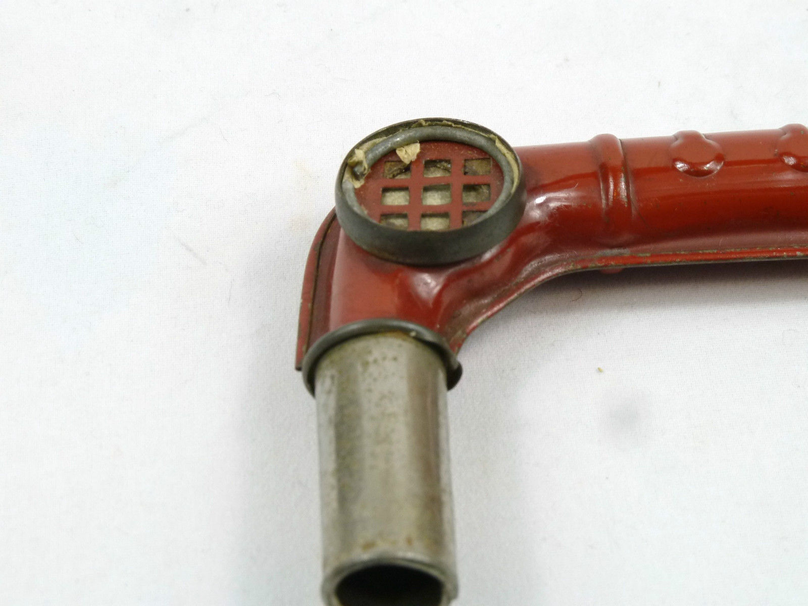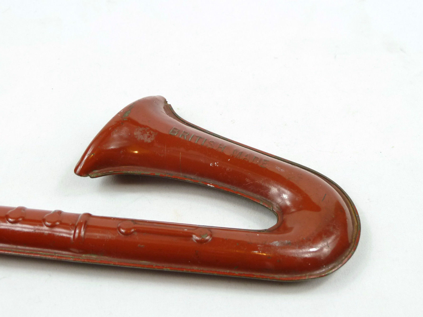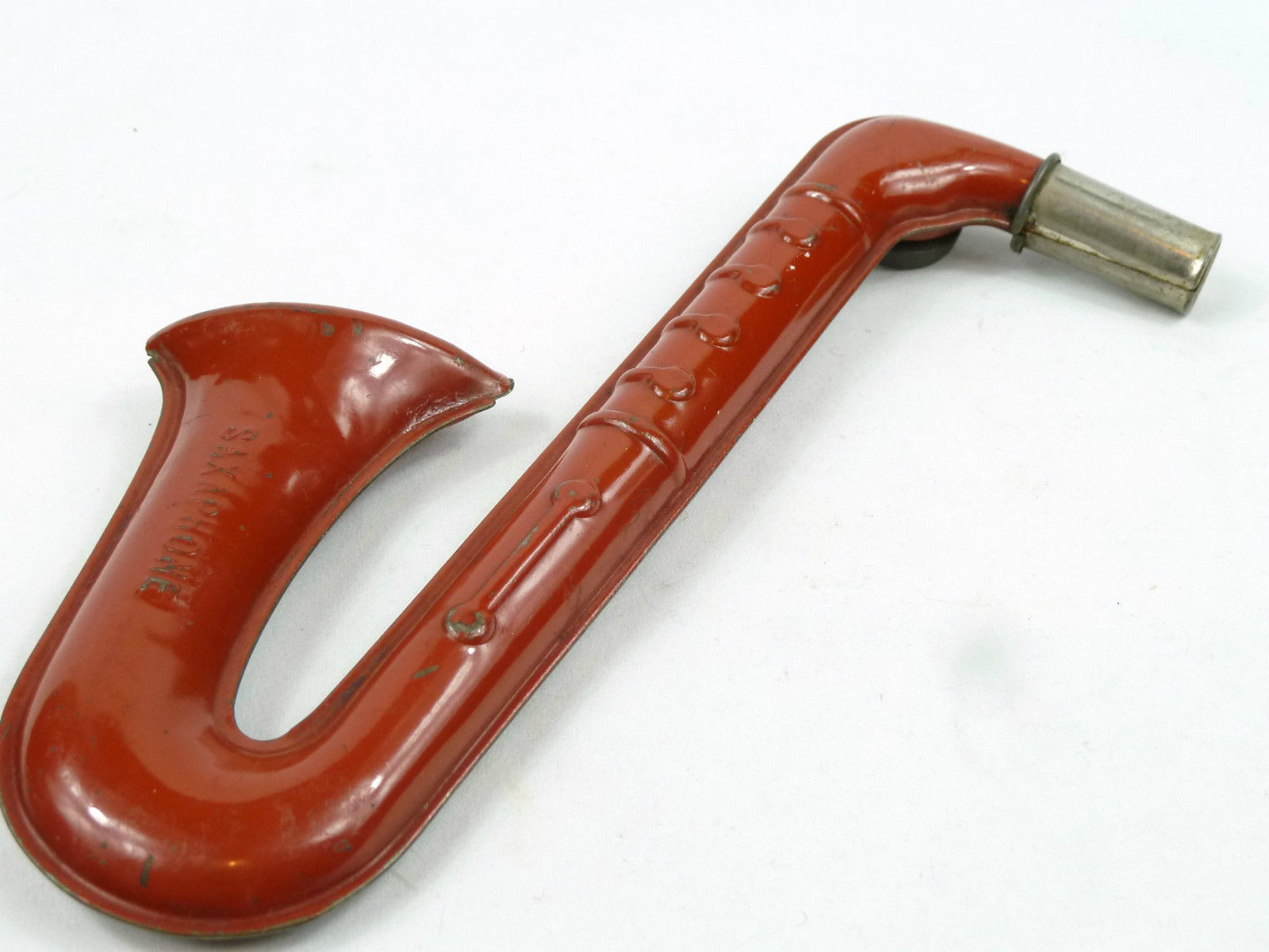 In trying to find out more about this vintage, little saxophone-shaped, British kazoo, I did a bunch of Internet searches. Unfortunately, I could not really turn up anything of interest. The only thing that I did come across was this Antique Price Guide Details Page, which shows 1 photo of the same toy with white paint, but not nearly in as nice a condition.