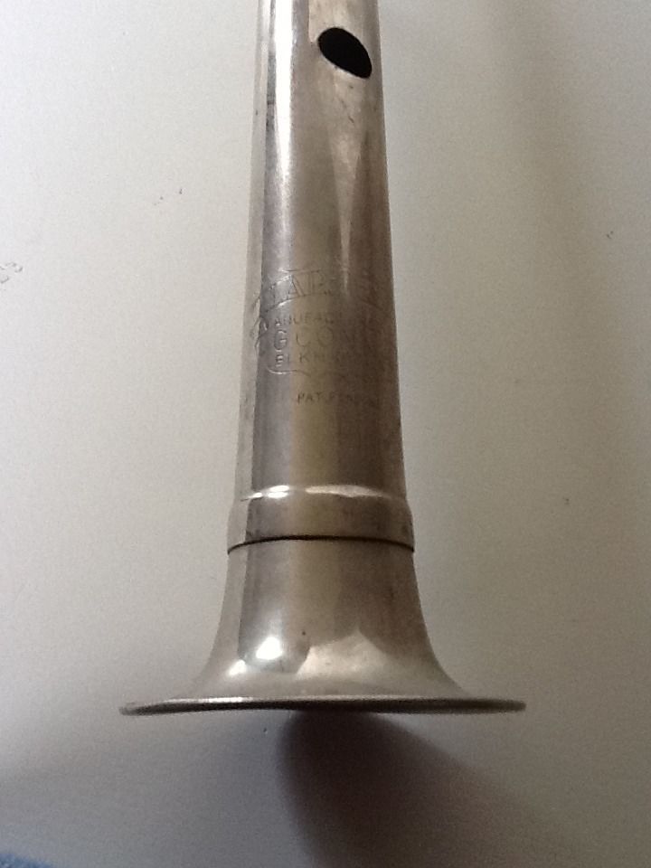 An extremely rare C G CONN metal Clar-O-Sax, or sometimes E flat sopranino sax, mouthpiece! This is a very early Conn mouthpiece. It is only 2 inches long and the inside shank measures only .469 inches. [It] has a very, very small chamber–you can see the comparison next to my Claude Lakey Bb sop mouthpiece in size… Its markings are on the end of shank. Reads: CG CONN LTD Elkhart Ind. mouthpiece is cast out of what looks like a version of solid nickel silver or German silver, similar to the old Goldbeck pieces. It is NOT plated.