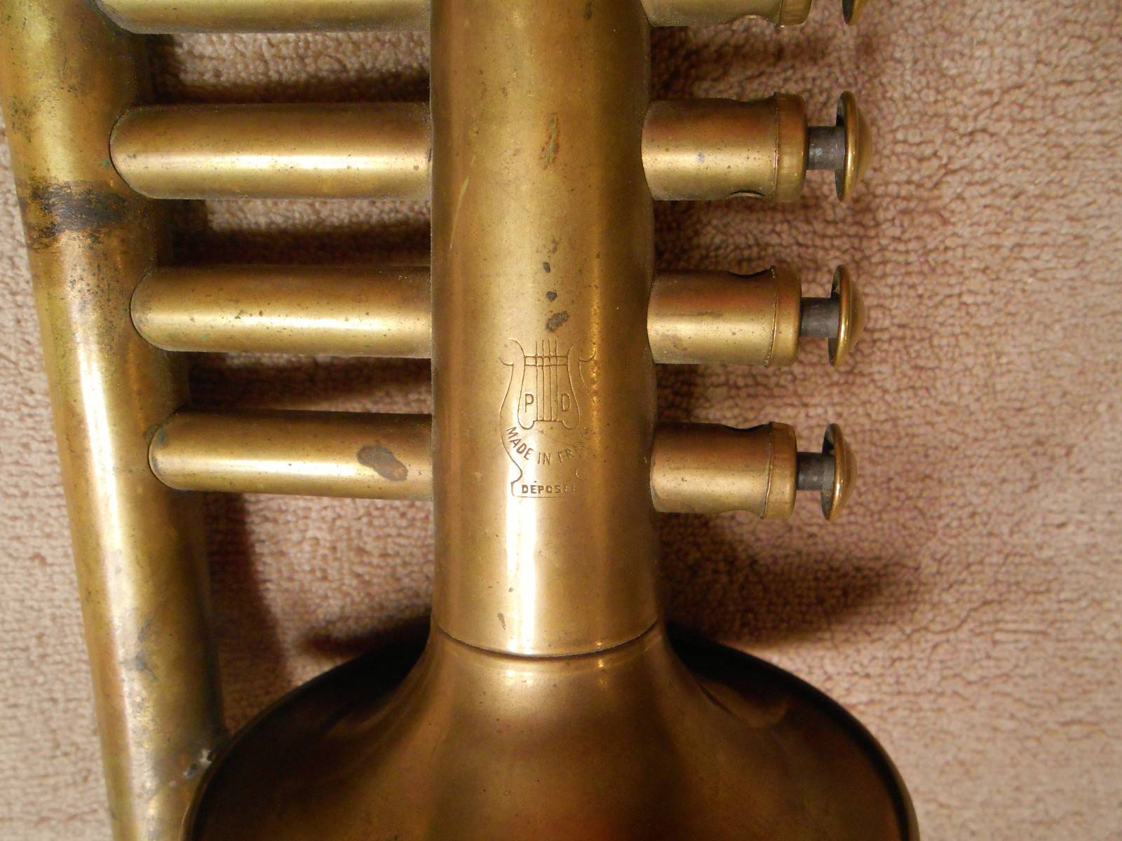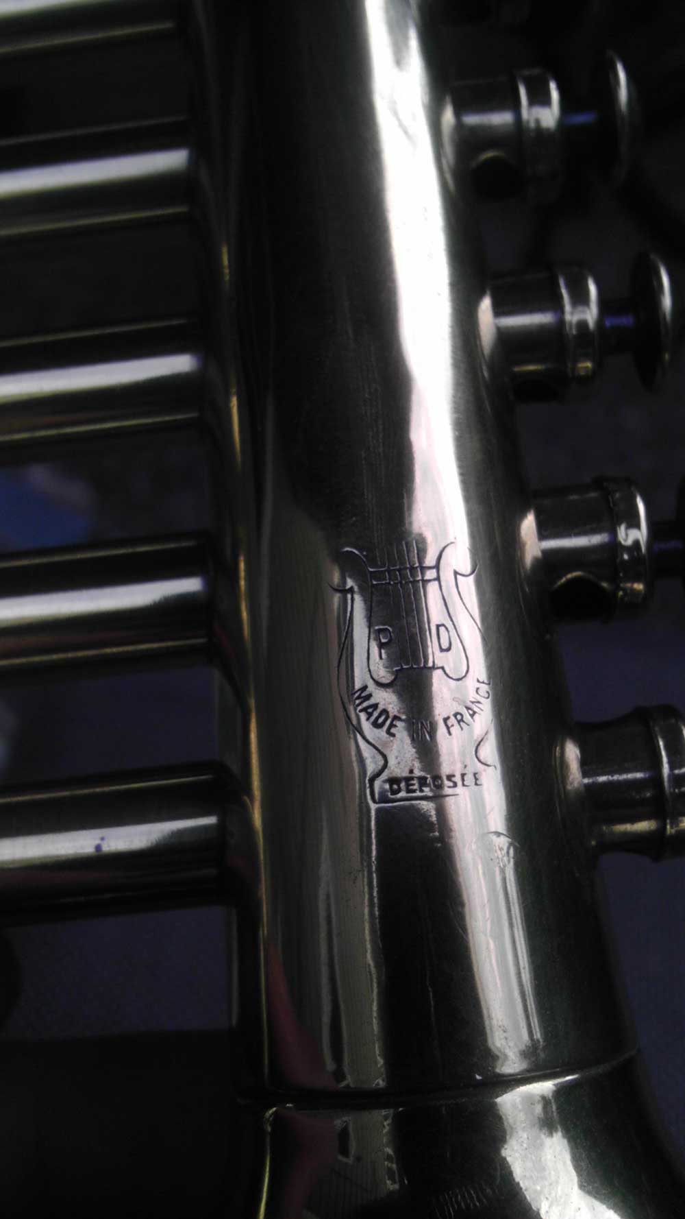 These French, toy horns are a really head scratcher. I have not been able to definitively identify who the manufacturer was. For the longest time I thought it was Déposée—based on the printing stamped on the horn—until someone commented on my blog that he believed the word meant “patent applied for”, or something similar in French. That would make sense, since my Pierret has the same stamping on its microtuner, and I was informed by someone in France that the company had obtained a patent for the neck and octave mechanism on the Concerto Model With Virtuor. (The model that I have)