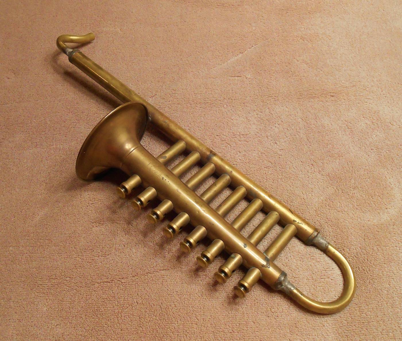 Here’s an interesting vintage toy saxophone. It’s all brass construction and the brass has a dark patina. It’s about 15 1/2 inches long and the bell is 3 1/4 inches in diameter. It plays a major scale, 1 whole octave with reeds that are like harmonica reeds. Pushing one of the buttons sends the air through that reed and sounds the note. You can play one note or as many of the notes as you like at the same time. It is missing the mouthpiece.