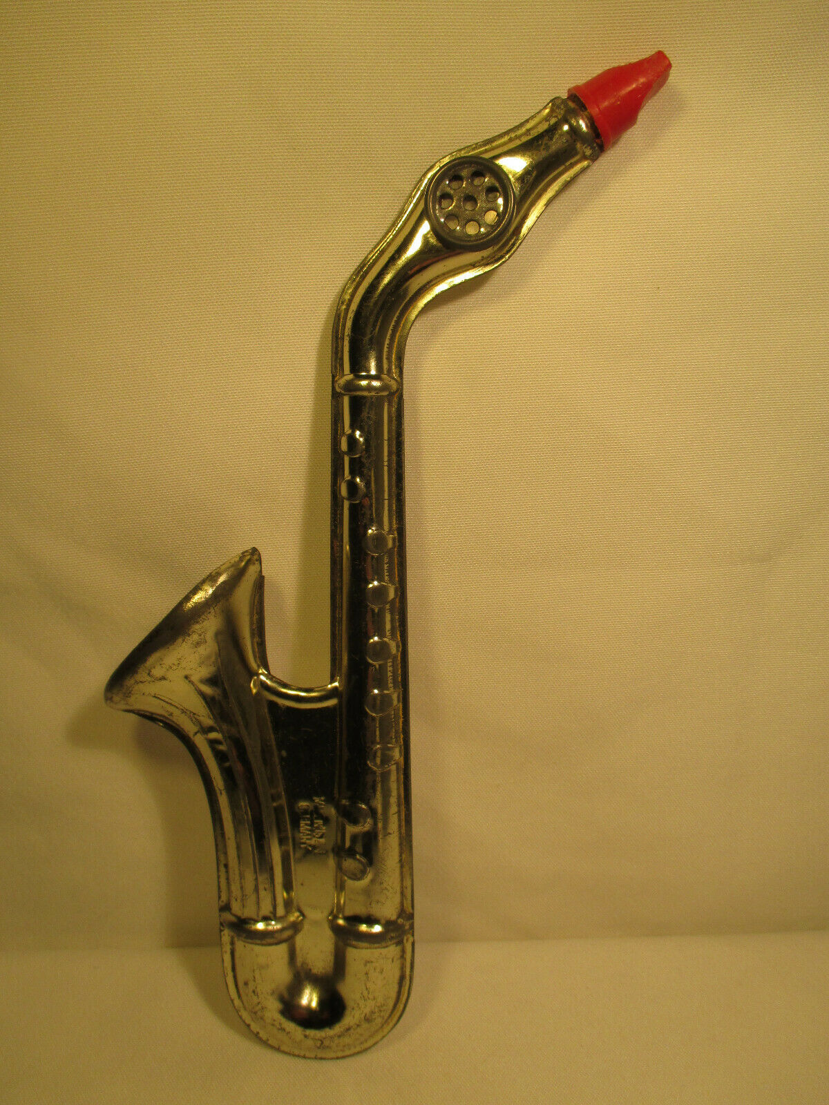 Unfortunately there is nothing on this German kazoo to indicate when it was made, or by whom. Although the seller claimed it was a “vintage musical tin toy”, he/she provided nothing to substantiate the claim. This sax-shaped tin sax may well be vintage (pre 1980), but without knowing who the manufacturer was, that would be hard to prove.