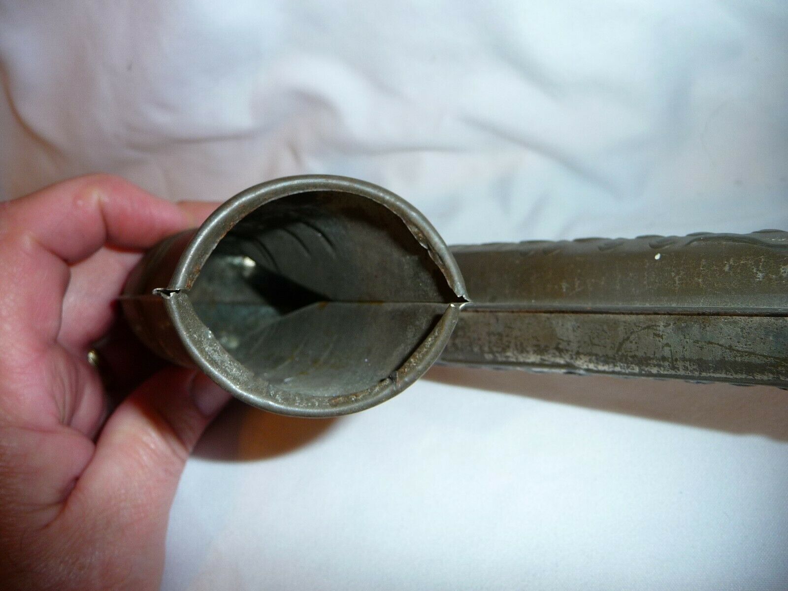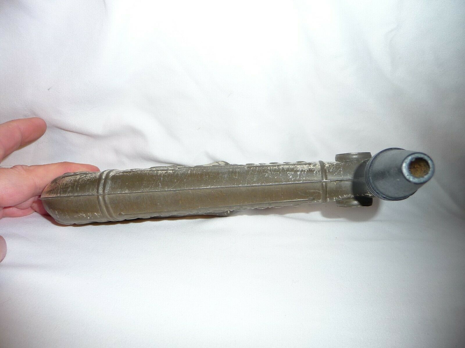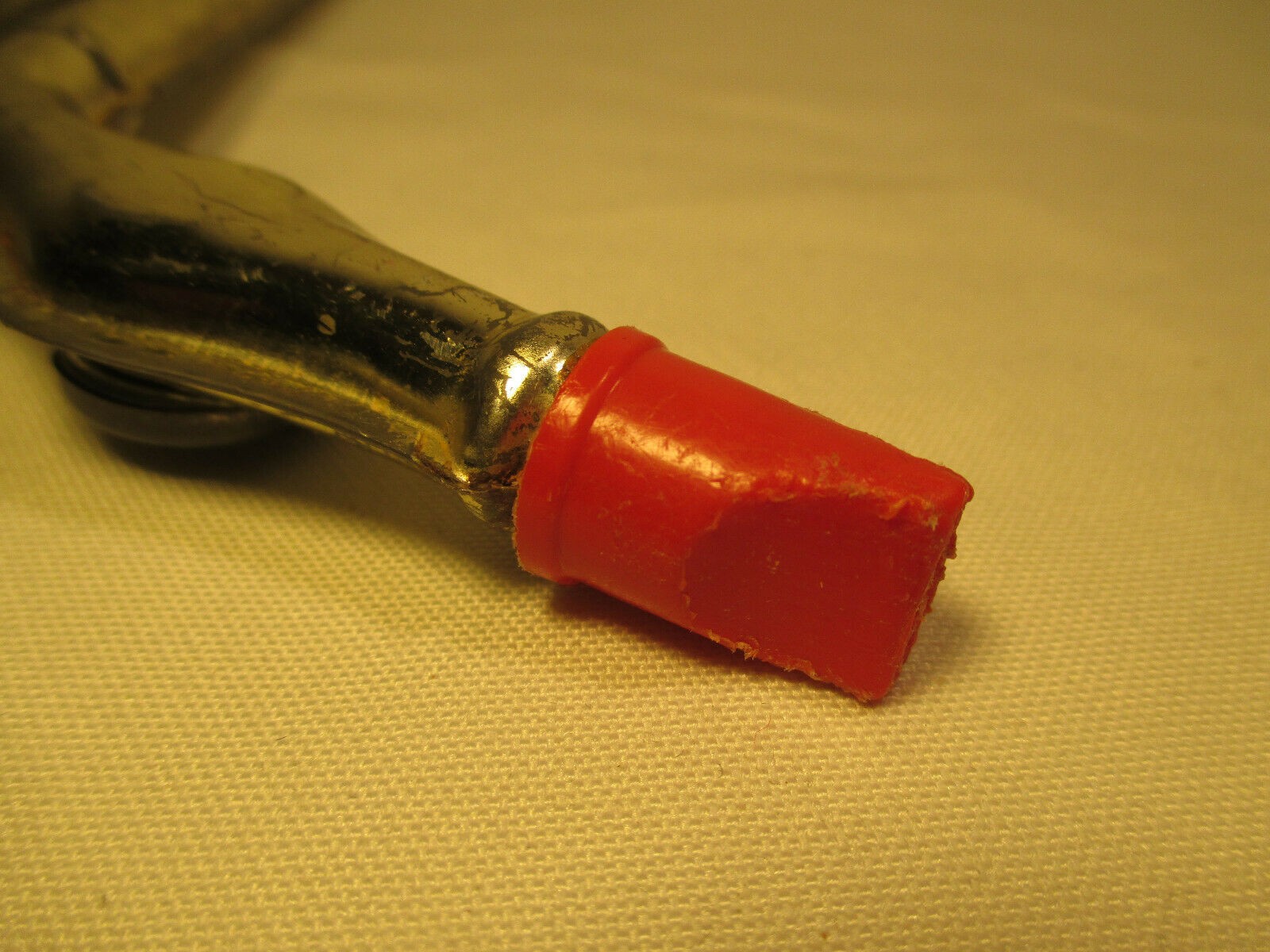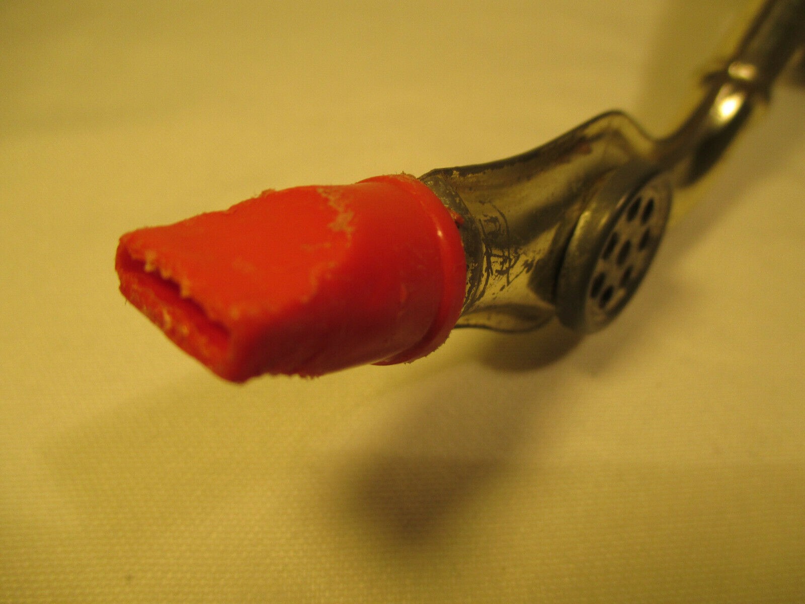 The seller notes that the kazoo is 9″ long, but that the paper is ripped. Sadly, this little guy no longer makes noise. It also looks to me like perhaps there is something missing around the bell lip?