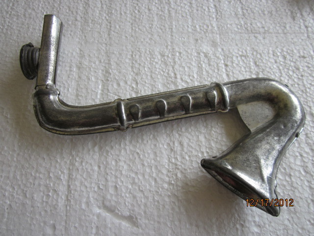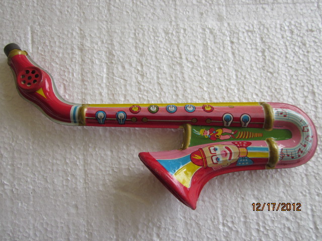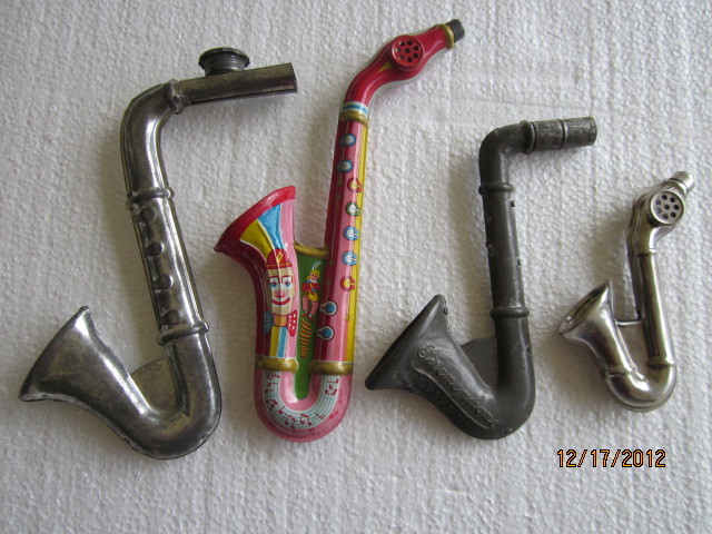 The seller said he believed that this saxophone-shaped kazoo was made of tin.