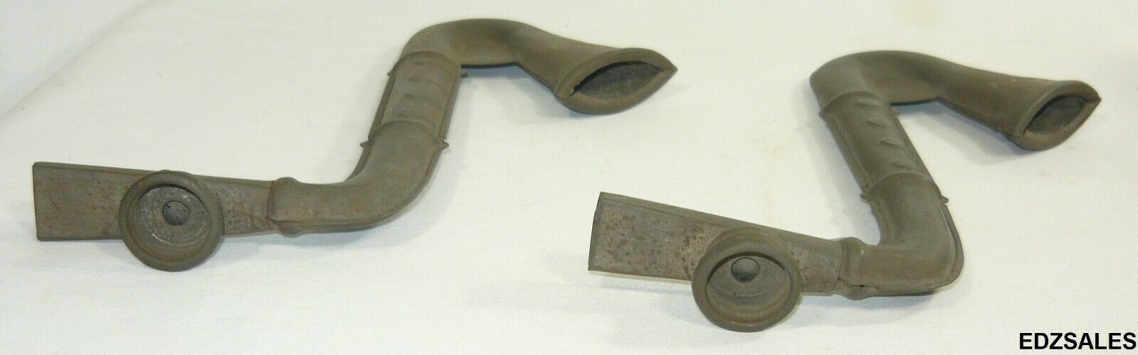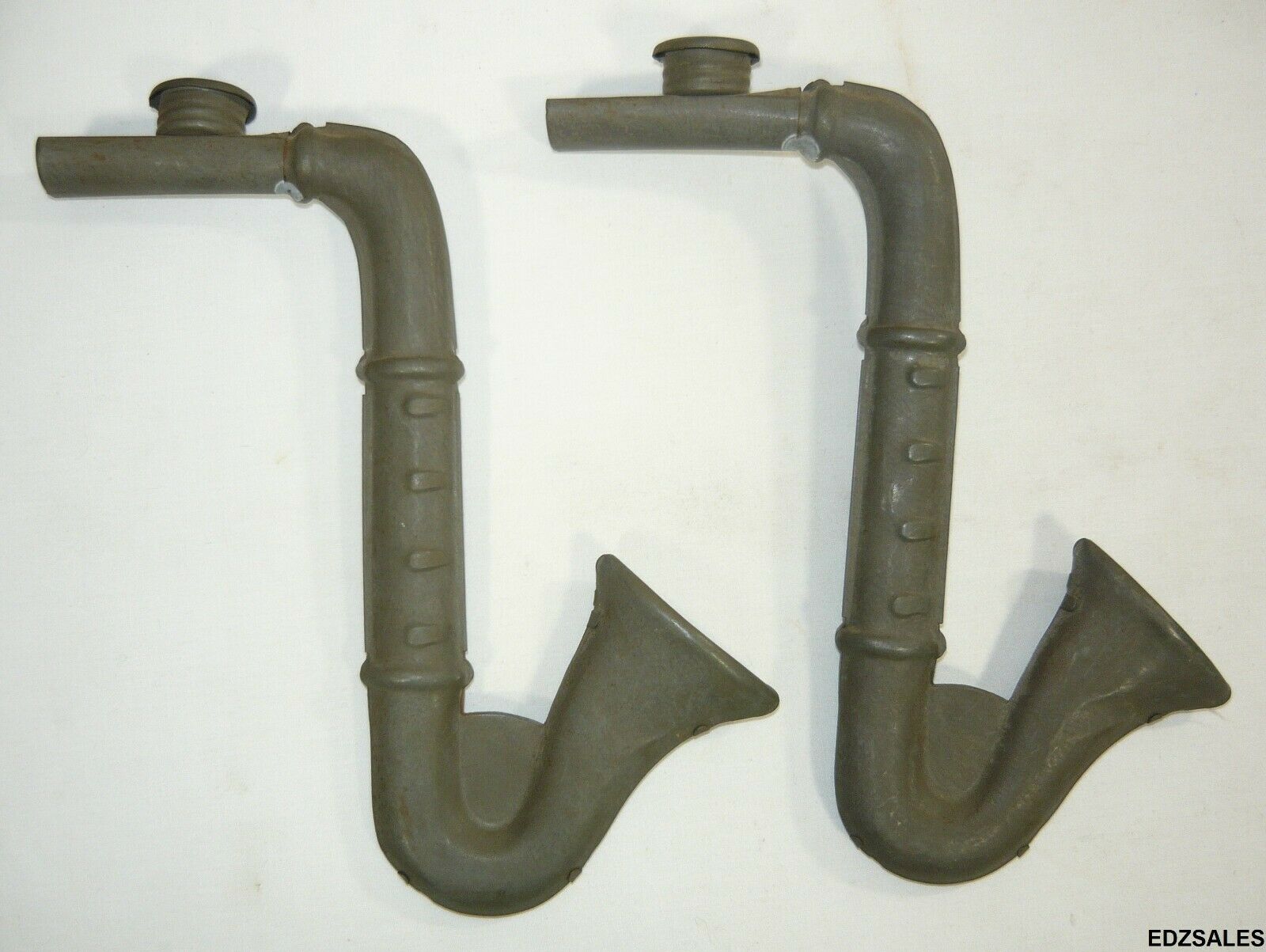 TWO (2) Toys. These vintage toys show wear from use including scuffs, scratches, discoloration, corrosion, and other wear from use and age. These toys were tested by blowing air into them, but no noise was made. Each toy measures approximately 8 inches in overall height, 6 3/4 inches in overall width, and 1 inch thick across the round top portion. To avoid missing details in writing, plenty of photos are included so purchaser’s can verify items themselves.