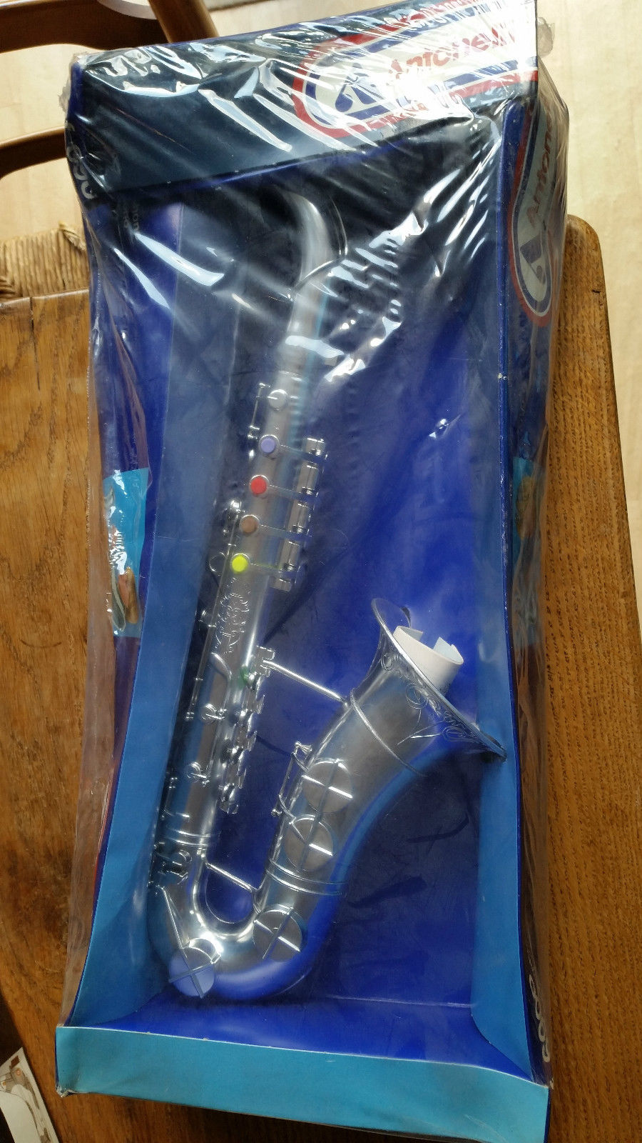 In September 2014, an Antonelli toy sax, model 6900 appeared on eBay. The little toy horn was still sealed like it came from the factory, and was described like this: