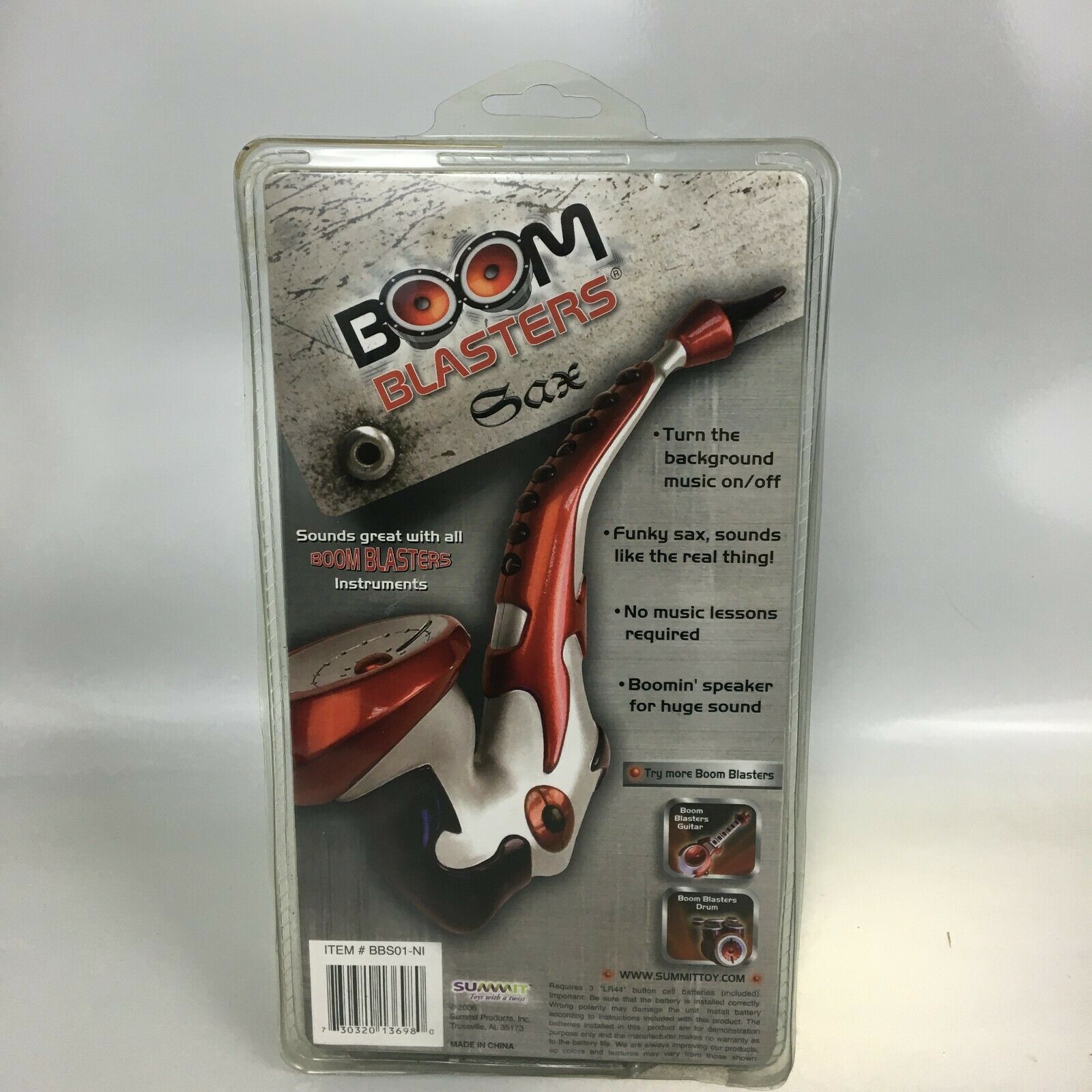 The Boom Blasters toy sax, guitar, and drums were made in China for Summit Products Inc. of Trussville, AL. From The research I have done, Summit Toys was founded in 1995, and was acquired by Panline USA on May 19, 2014.