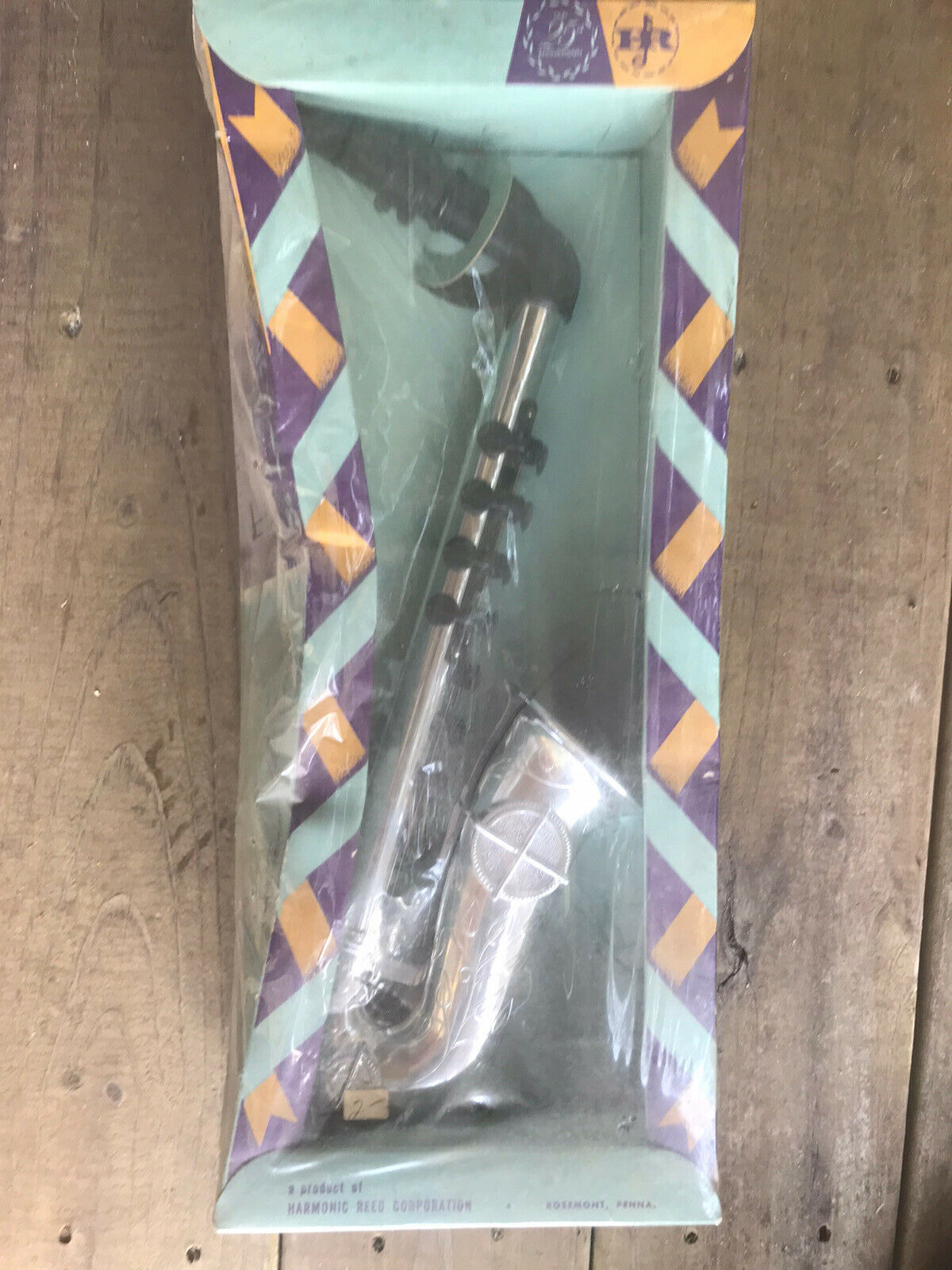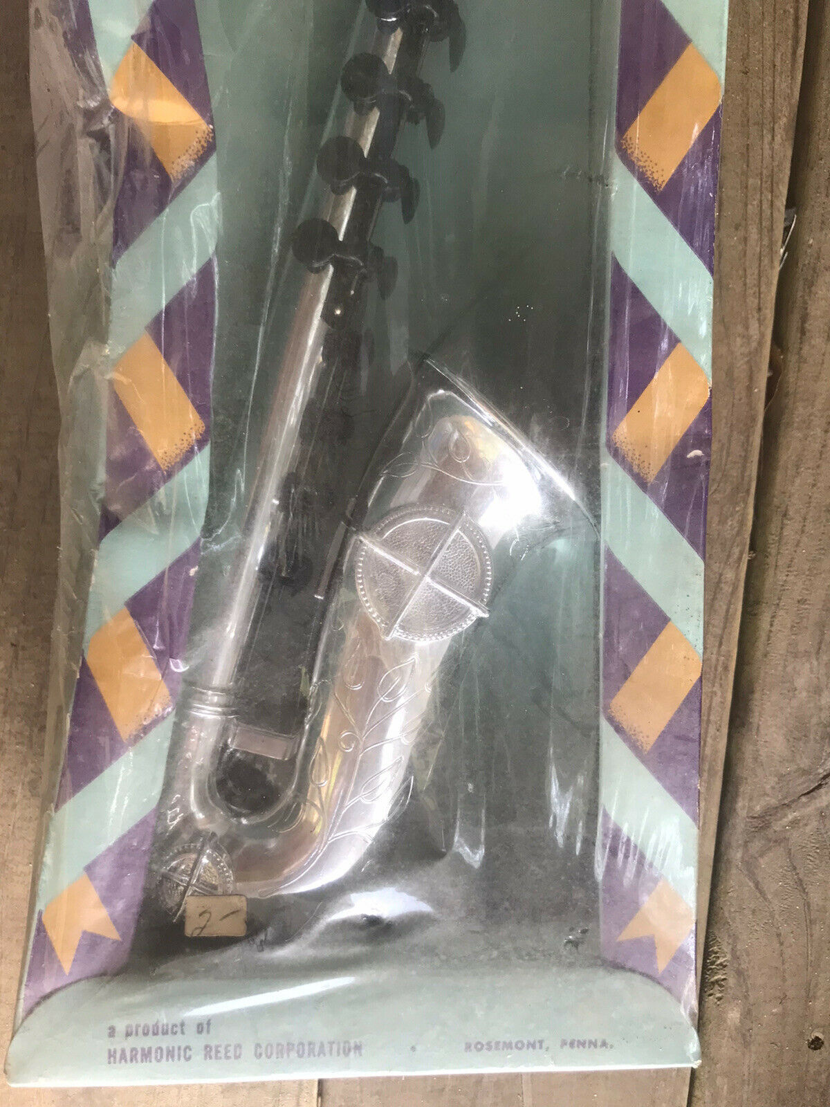 Manufactured by Harmonic Reed Corp. Philadelphia, Pa. Made of sturdy plastic with clear tone reeds, the sax is in very good condition with the exception of some minor scuffing to the surface and one key pad will not reseat after depressing (very fixable I believe). The saxophone is in good working condition. Silver plastic body with eight keys.