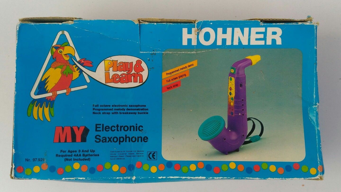 I had not been able to find out anything about this electronic toy saxophone from Hohner. The seller offered up no information, and Google hadn’t brought up anything either. The only thing I knew for certain is that it was part of the Play & Learn series–just like the Hohner Kinder Saxophon was.