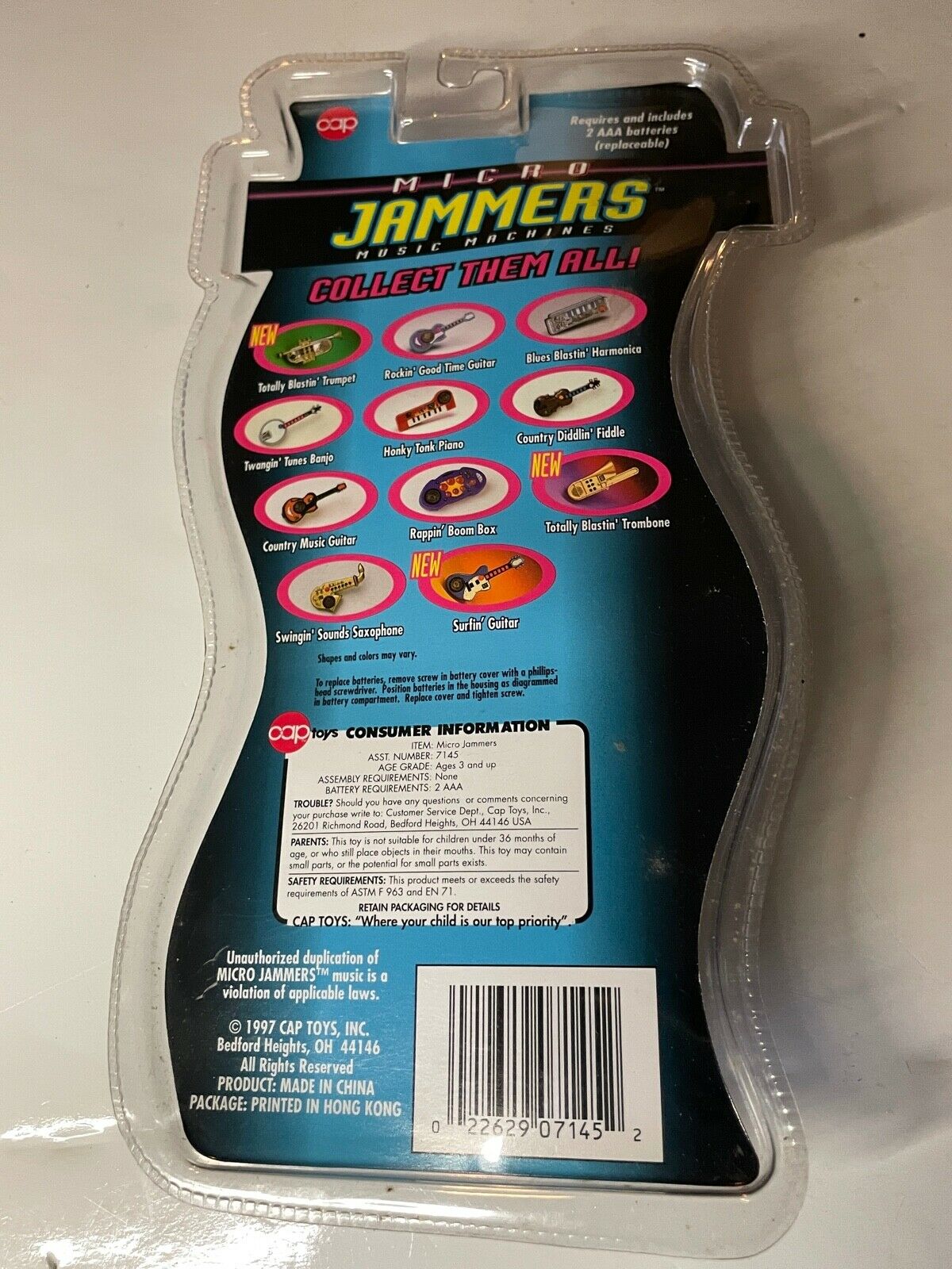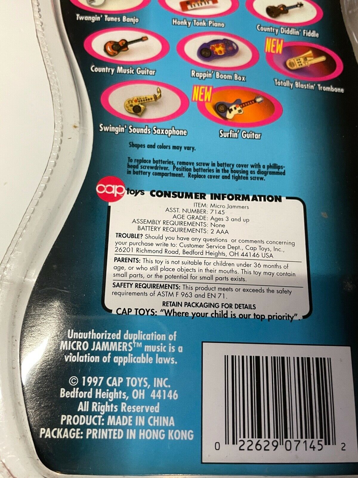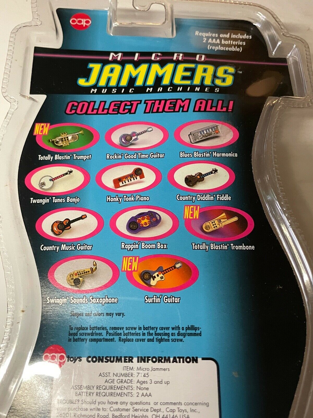 Other than stating the painfully obvious—what it says on the back of the toy itself—I really can’t offer up much. This Micro Jammer sax was made by the Cap Company Inc., and has a copyright of 1995. Through my research I did discover that this sax was one of a series of musical instruments that the Cap Company produced under the Micro Jammer name. Other instruments included: a trumpet, various styles of electric guitars, a banjo and drums.