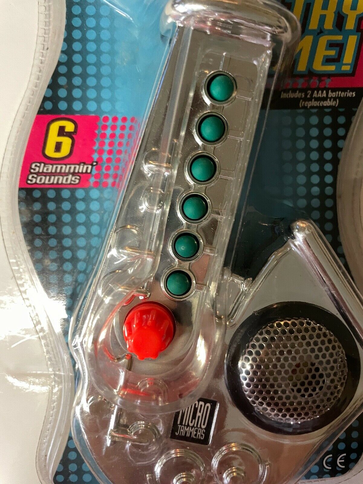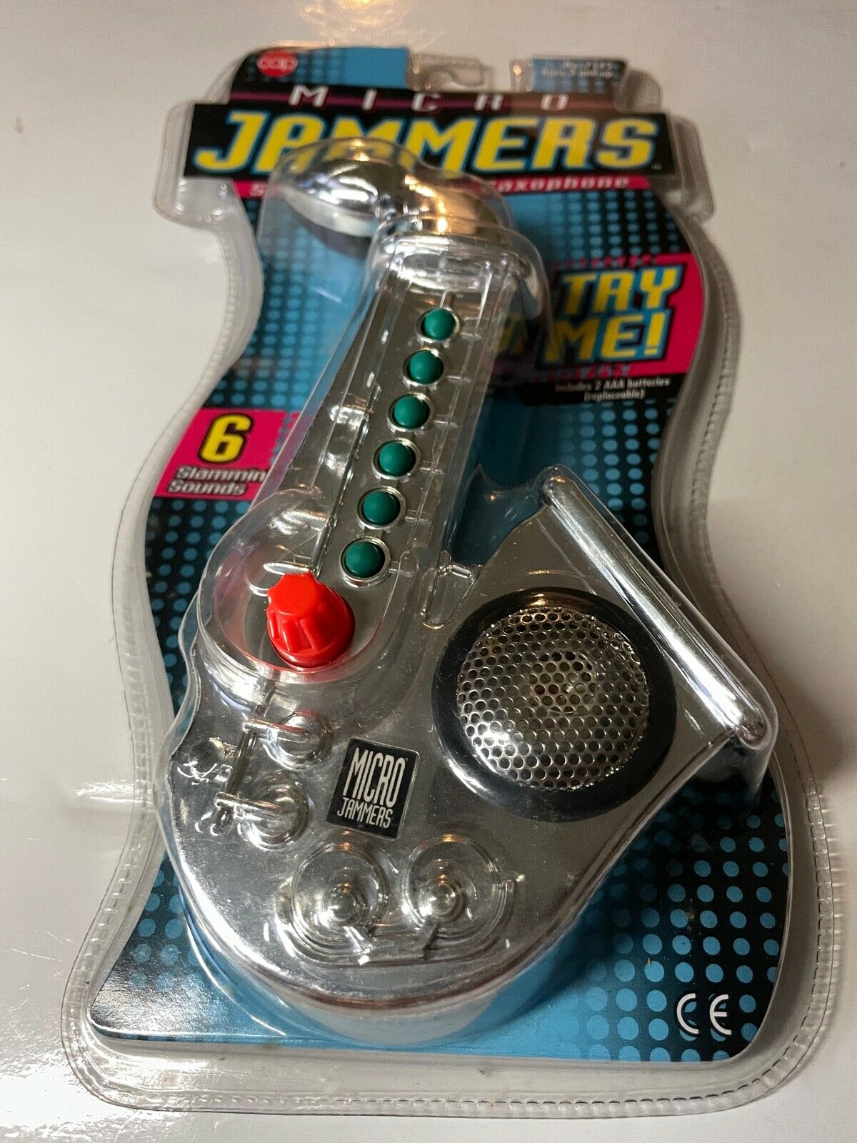 This Micro Jammers Sax is really the most informative. Its original packaging shows us the name the saxophone was given by the company: Swingin’ Sounds Saxophone.