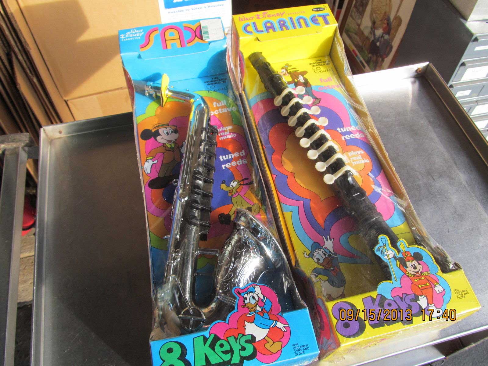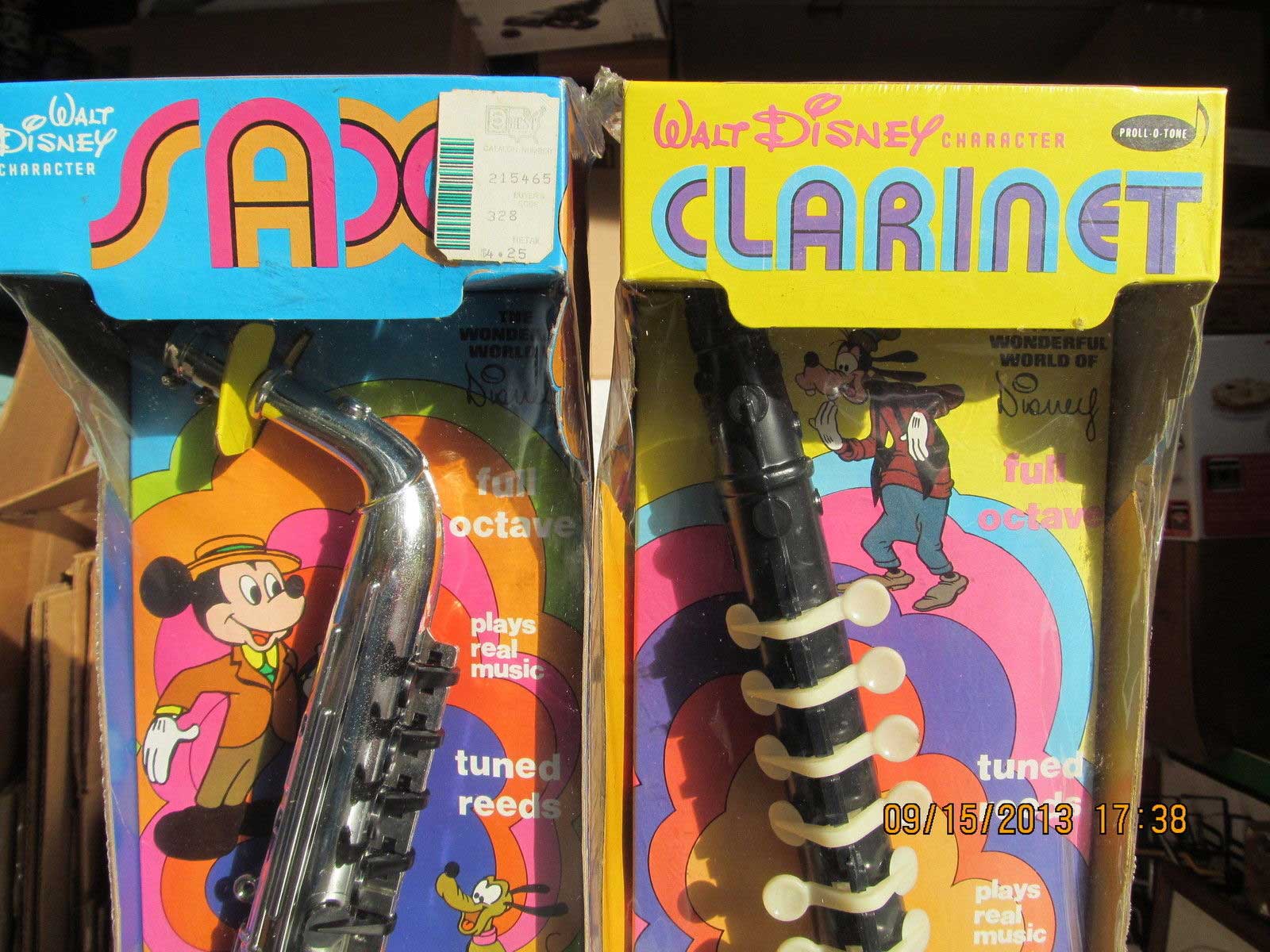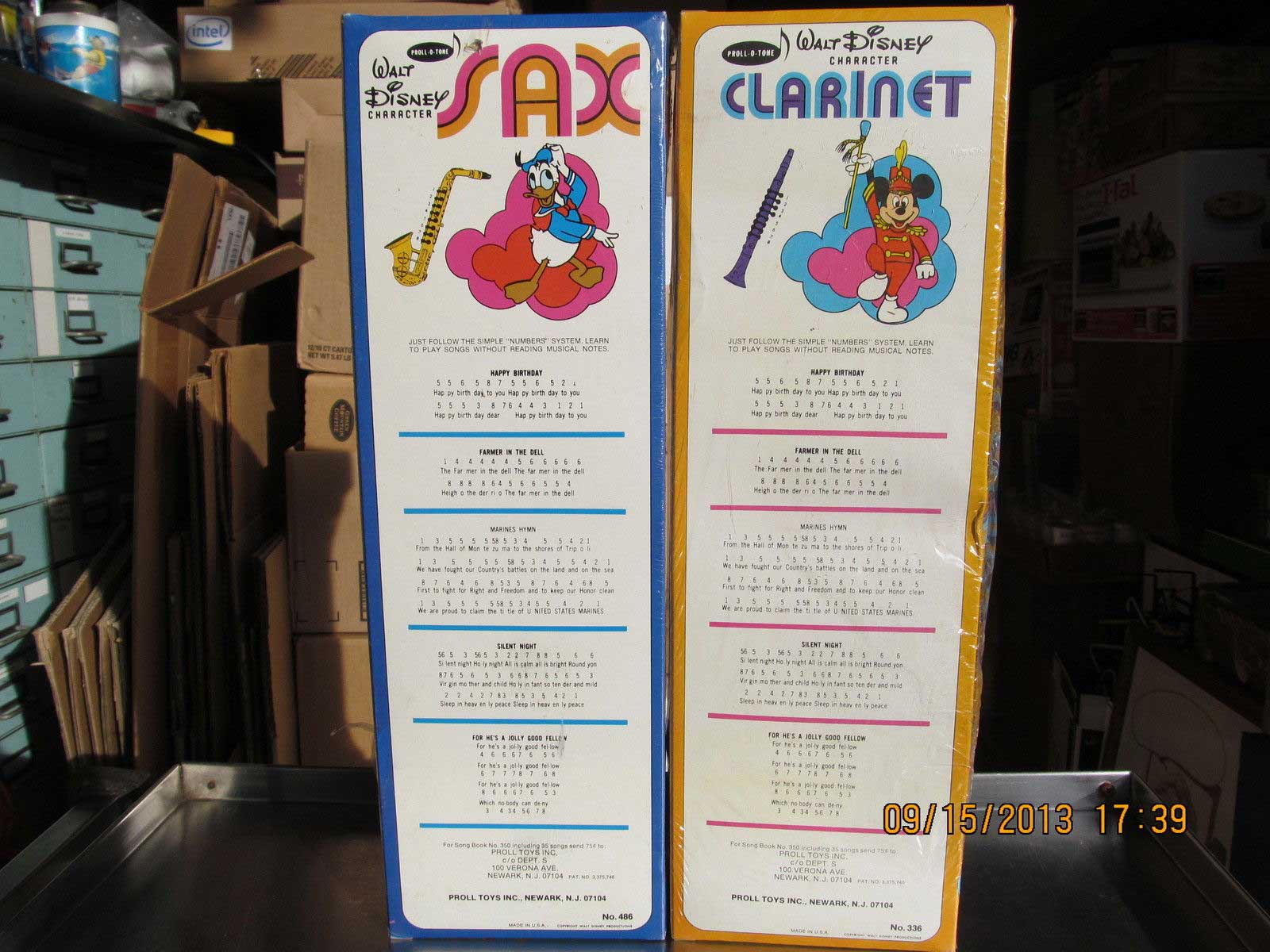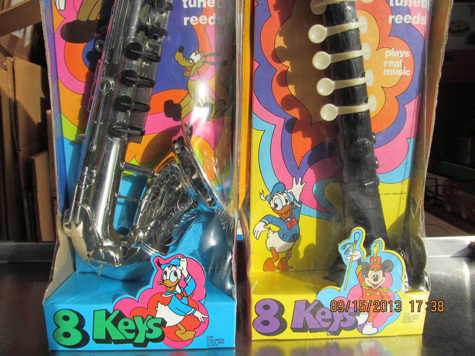 …These are large plastic toys, each box is 17.25 inches long. The Sax by Proll-O-Tone has eight keys and is mint and still sealed in the plastic. The colorful box has Mickey, Pluto, Minnie, Donald & Uncle Scrooge . The plastic has one small tear at the edge. The Clarinet also by Proll-O-Tone has eight keys and is mint and still sealed in the plastic. The colorful box has Mickey, Goofy Dumbo, Donald & One of the Dwarfs. Both of these have the instructions on the back. Very light wear on the packages if at all. These were made in Newark New Jersey. Copyright Walt Disney Productions. The patent is from 1968…