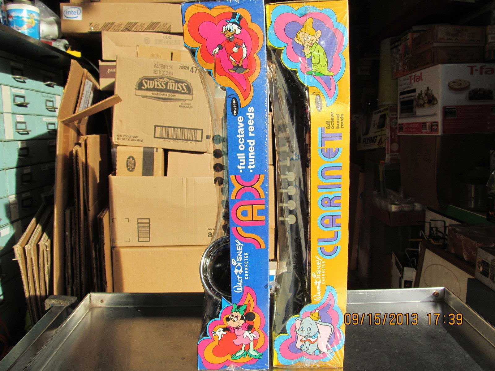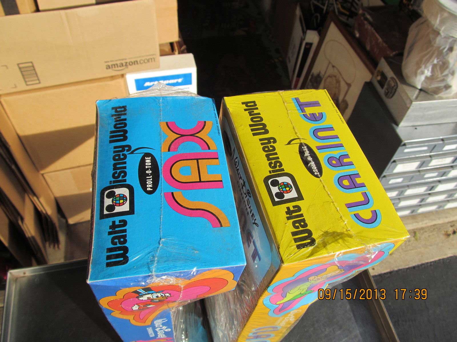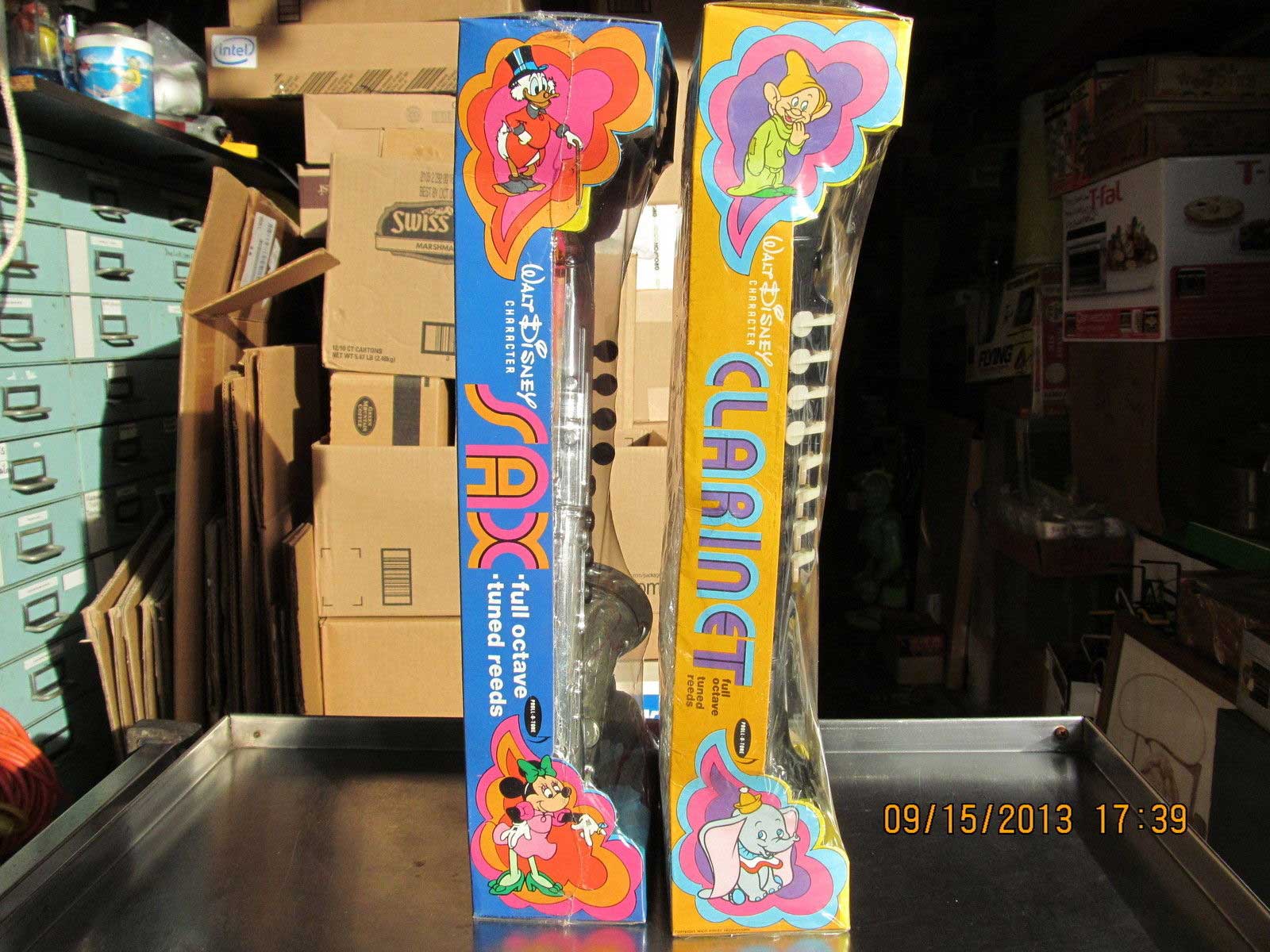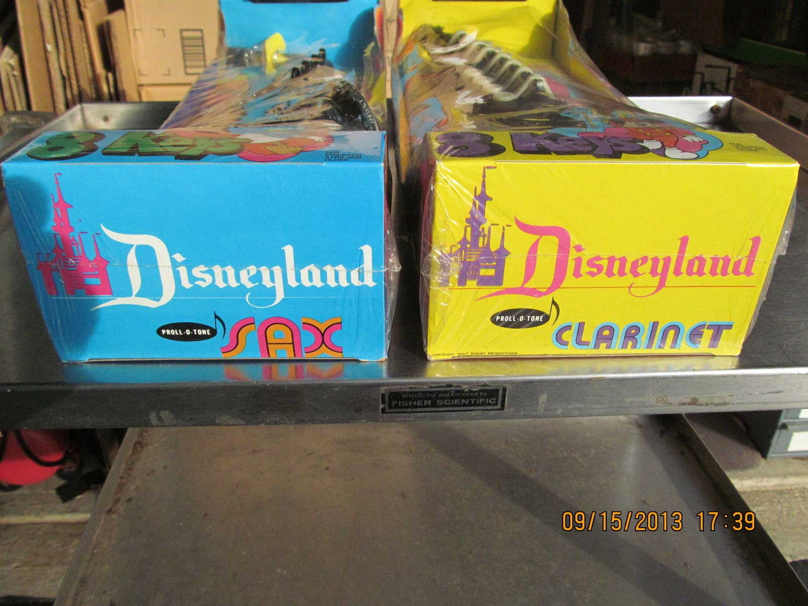 …These are large plastic toys, each box is 17.25 inches long. The Sax by Proll-O-Tone has eight keys and is mint and still sealed in the plastic. The colorful box has Mickey, Pluto, Minnie, Donald & Uncle Scrooge . The plastic has one small tear at the edge. The Clarinet also by Proll-O-Tone has eight keys and is mint and still sealed in the plastic. The colorful box has Mickey, Goofy Dumbo, Donald & One of the Dwarfs. Both of these have the instructions on the back. Very light wear on the packages if at all. These were made in Newark New Jersey. Copyright Walt Disney Productions. The patent is from 1968…