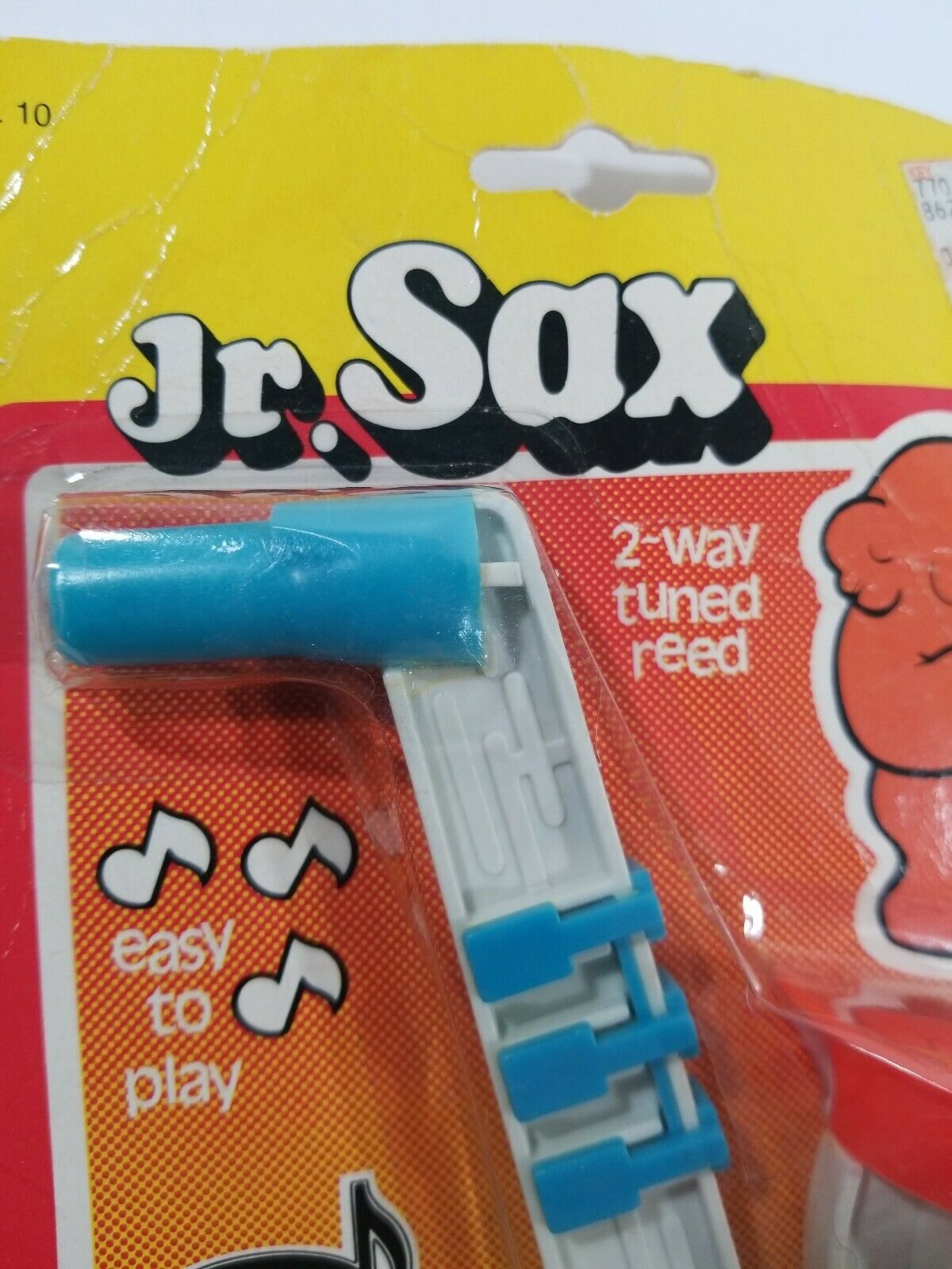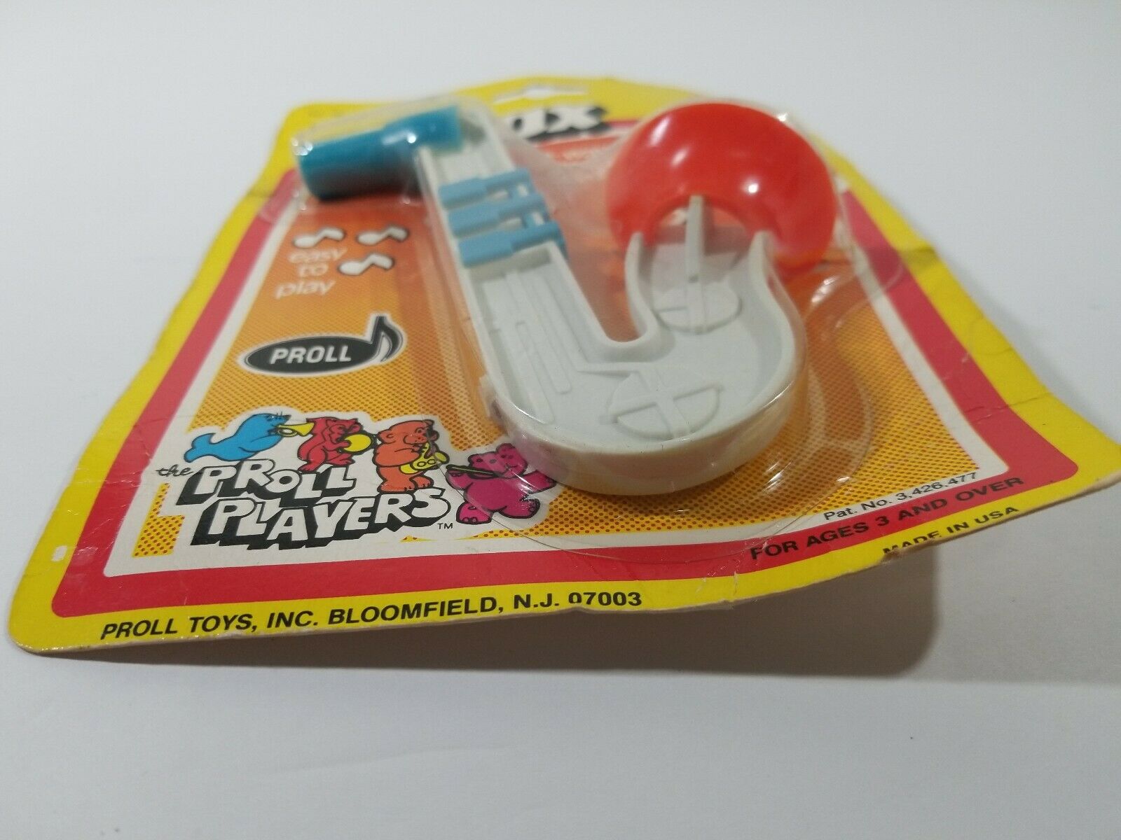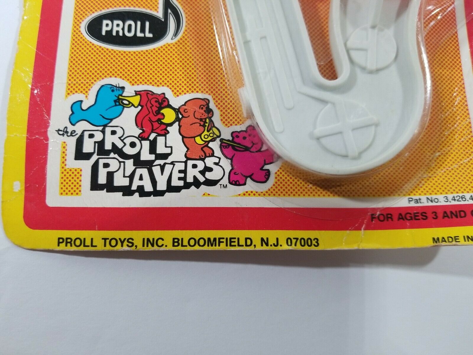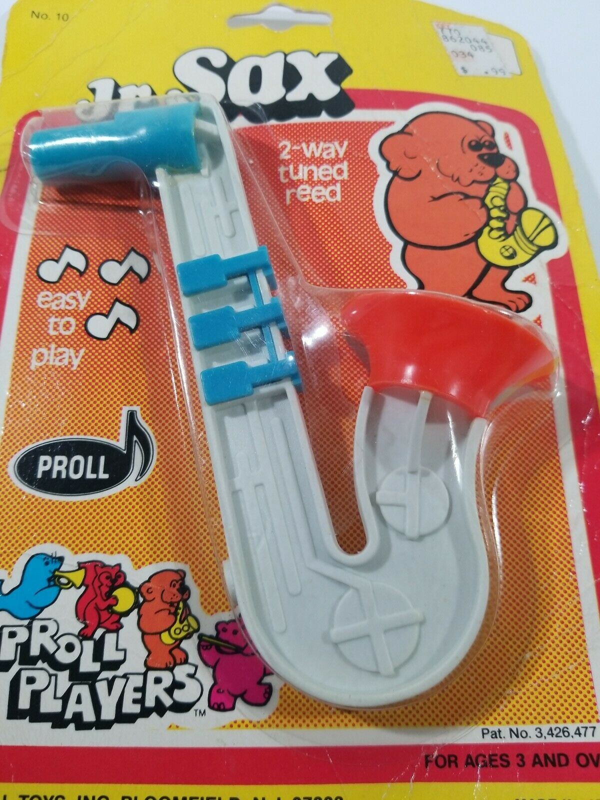 This Jr. Sax by Proll Toys appeared on eBay in its original packaging. The seller didn’t provide a date, but from the sticker on the package we can see that it originally sold for 99¢. From the package itself, we can see a couple of other interesting things: It is designated No. 10 by Proll Toys; and is marked Pat. No. 3,425,477.