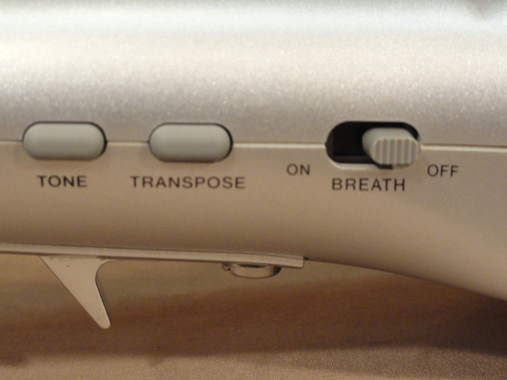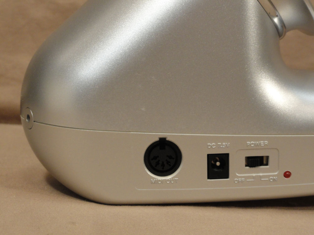 There are switches to select the sound, transpose (2 octaves), and a Breath switch which allows you to play the horn without needing to blow into it if desired. There are also connections for headphones, MIDI OUT, and an AC adaptor (AC adaptor not included). The DH-100 also runs on five “AA” batteries making wireless a possibility using a standard wireless guitar system. There is a power-on LED indicator…
